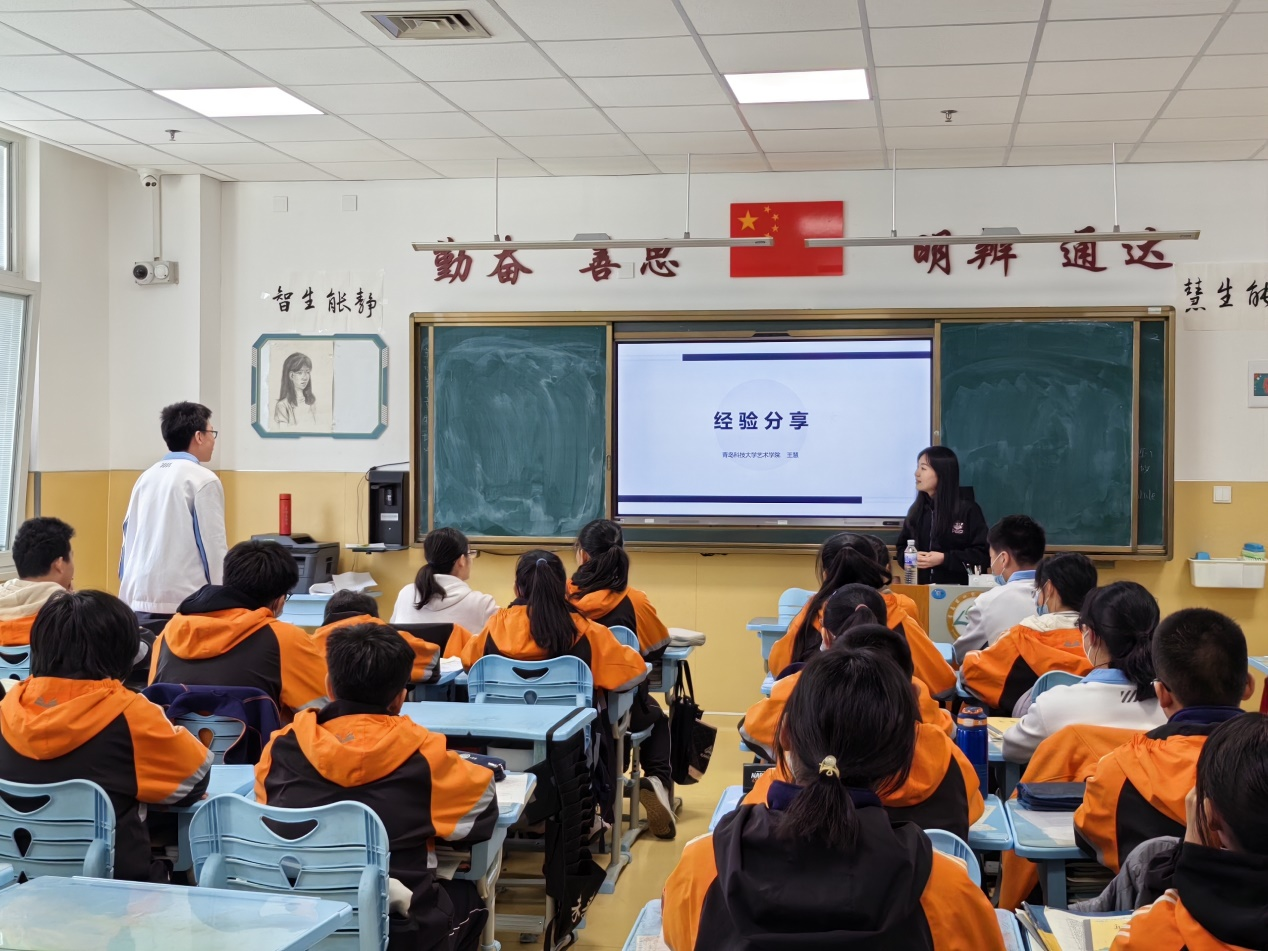 艺术学院学生会、研究生会代表赴青岛第四实验初级中学开展对话交流会。学生会副主席王慧做了一场“我的学习生涯”的报告,她结合自身在中学、大学的学习、工作和生活经历, 给中学生们分享了自己的学习经验、技巧、心得,也介绍了丰富多彩的大学学习、科研、文体和娱乐生活。她建议同学们在奋斗的年龄多向老师同学请教,多与父母沟通,树立远大目标,努力自主学习,积极向上,不负年华。