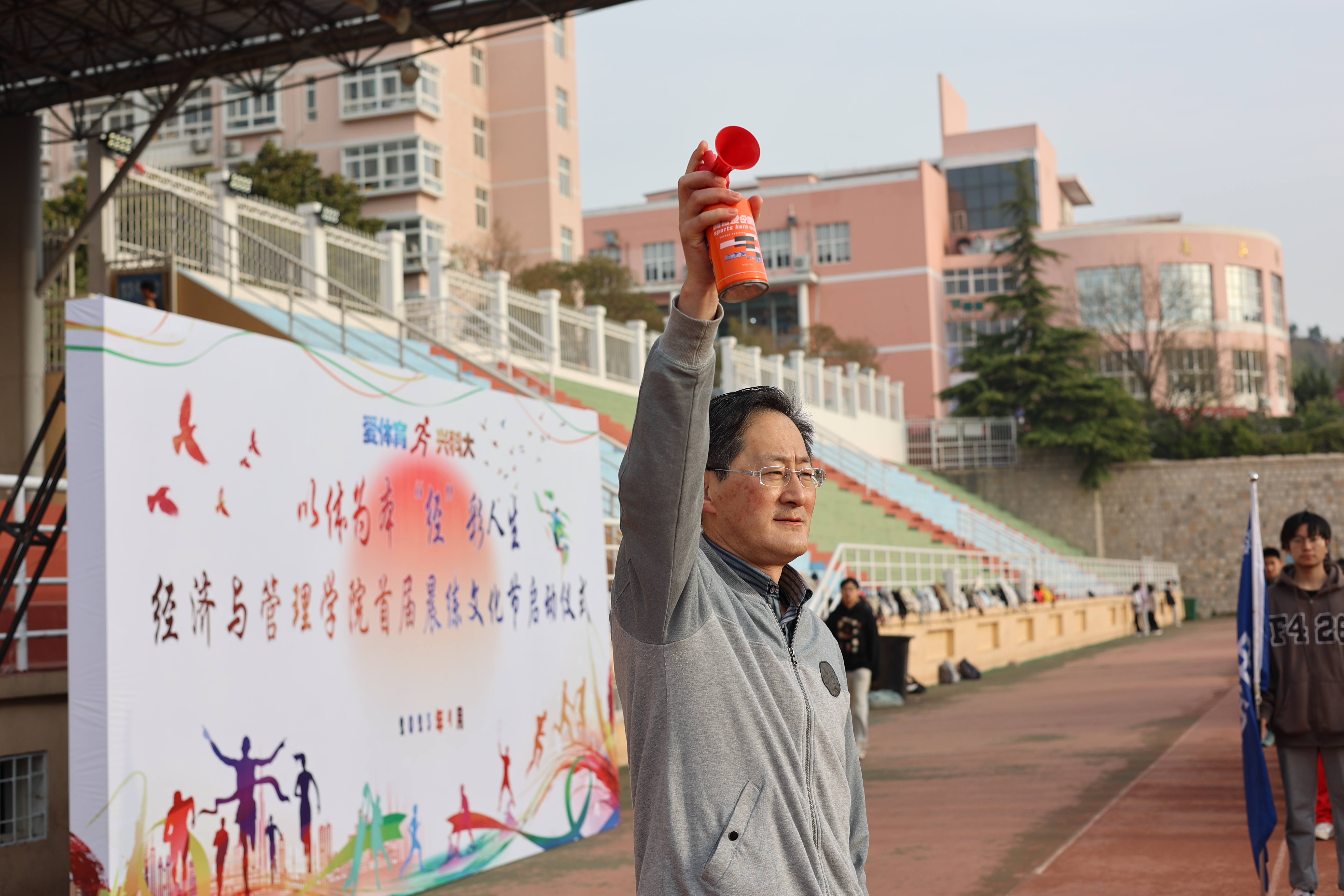 4月18日清晨,经管学院“以体为本 ‘经’彩人生”首届晨练文化节在崂山校区田径场举行,学校体育综合改革领导小组办公室常务副主任楚晓东、学生工作部副部长曹永俊、校团委副书记陈兵、党委(校长)办公室副主任步德胜、王帅、党委巡察工作办公室副主任张玉出席启动仪式,仪式由经管学院党委副书记牛宝卫主持。