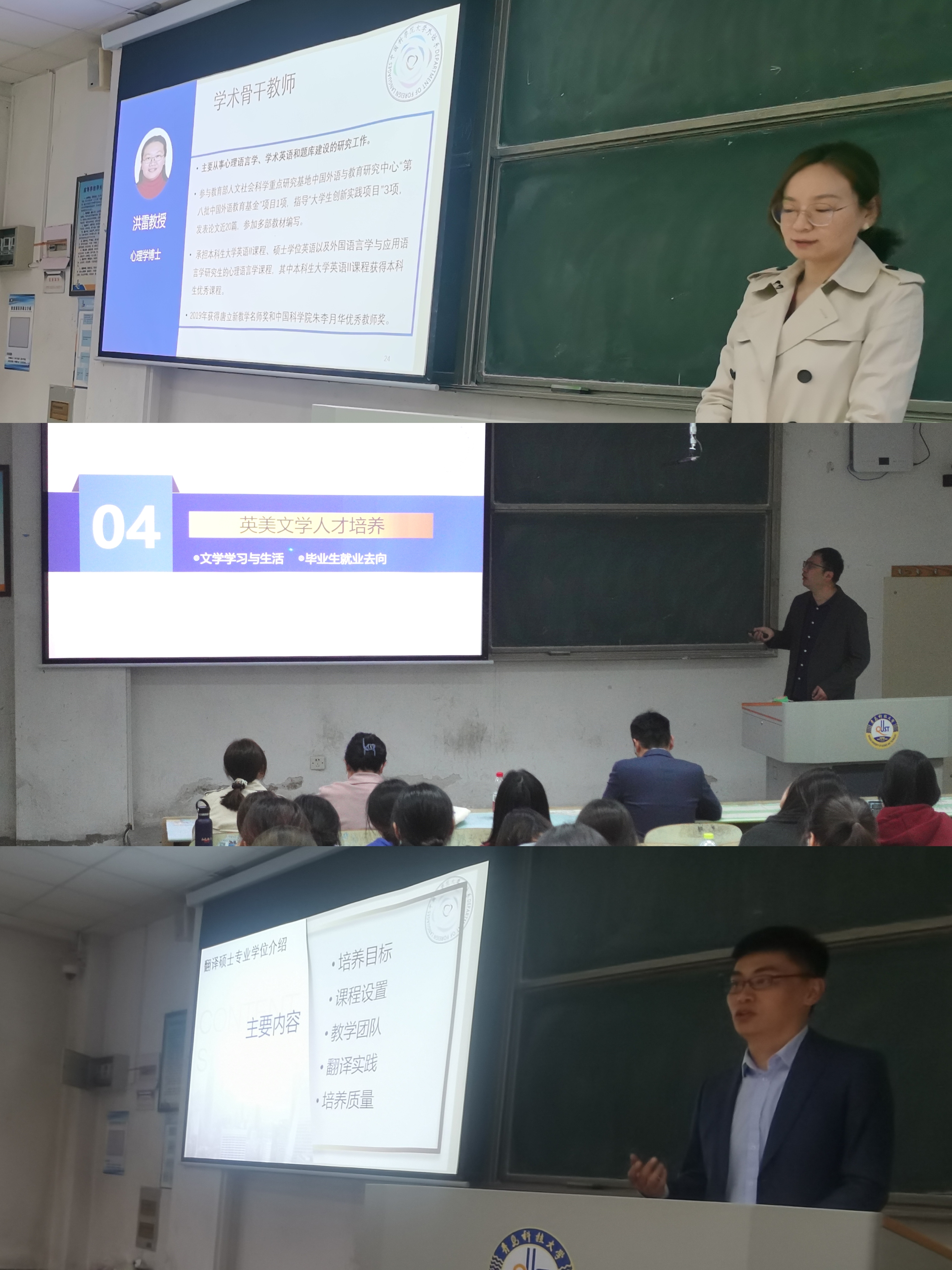 4月22日晚,中国科学院大学外语系一行莅临外国语学院开展硕士招生宣讲活动。活动于弘毅楼B101教室举办,活动嘉宾有中国科学院大学外语系李晰老师、安帅老师、范嘉舜老师,以及万象城allwincity官网外语学院毕业生、国科大外语系在读硕士研究生金秋同学。活动由外国语学院团委老师张湘钧主持,学院团委书记刘妍君参加活动。