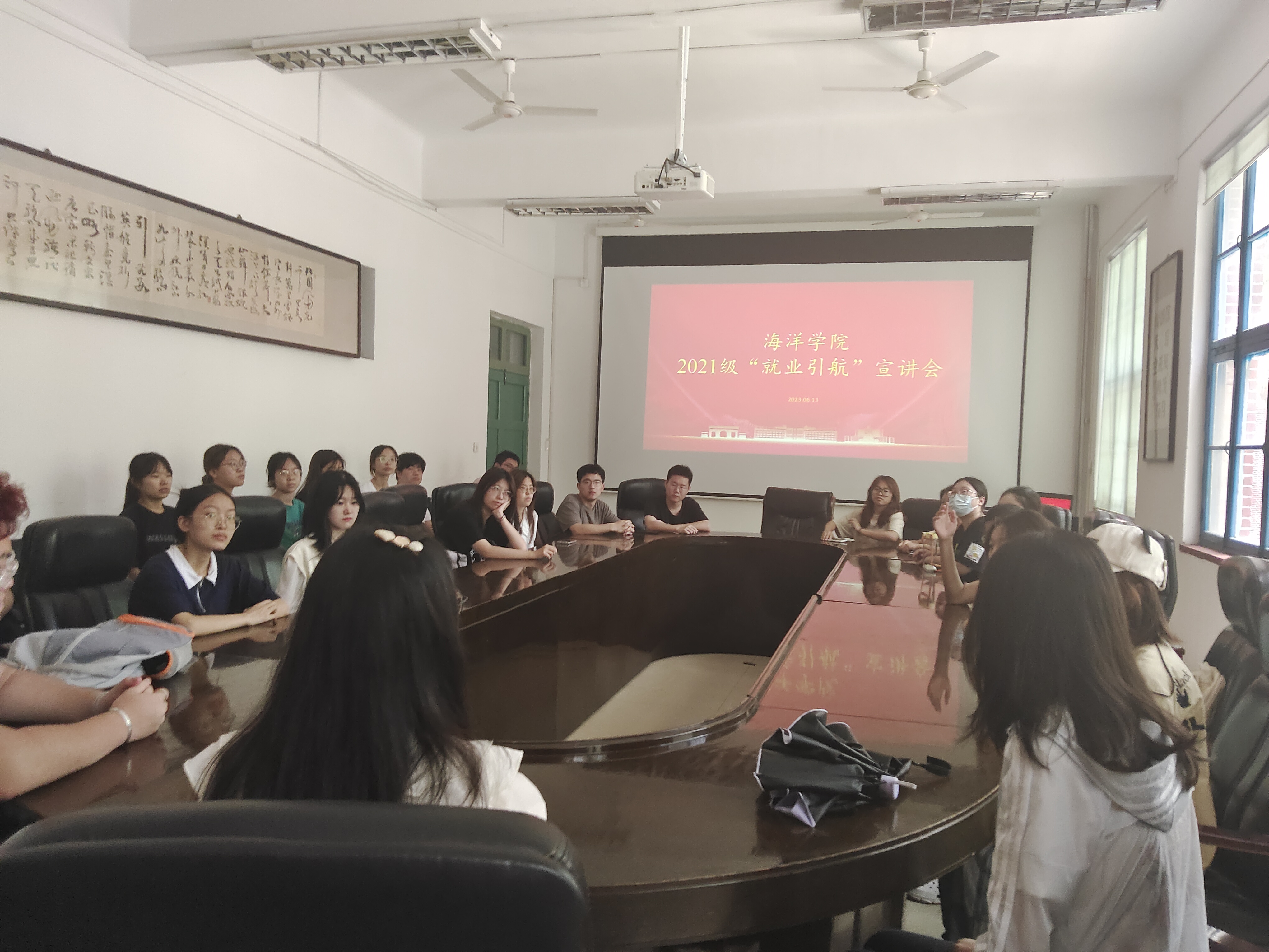 为深入贯彻落实党的二十大精神以及中央经济工作会议提出的“把促进青年特别是高校毕业生就业工作摆在更加突出的位置”的重要要求,6月13日,海洋学院团委开展2021级“就业引航”宣讲会,2021级辅导员吕珊珊主持会议。