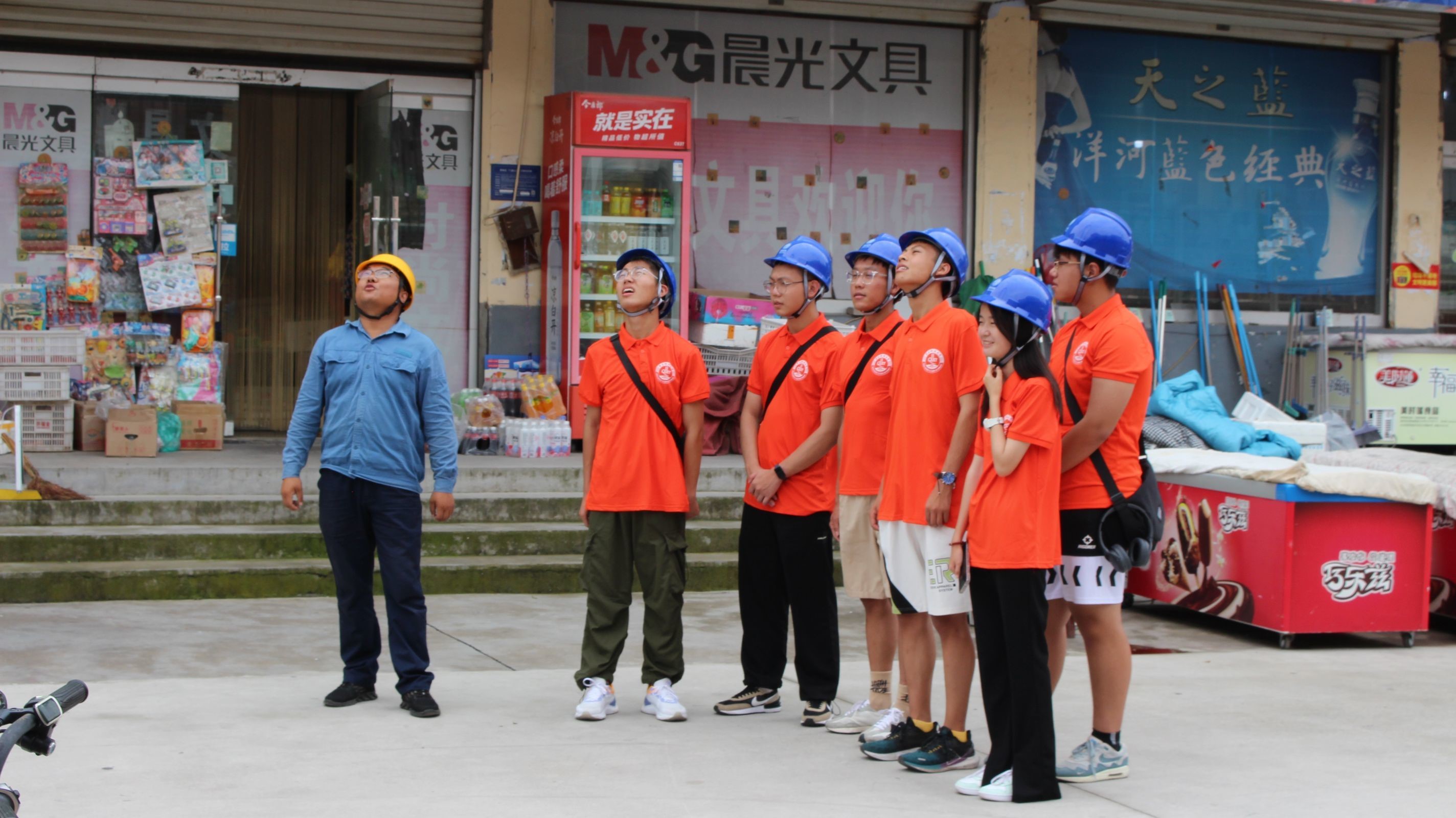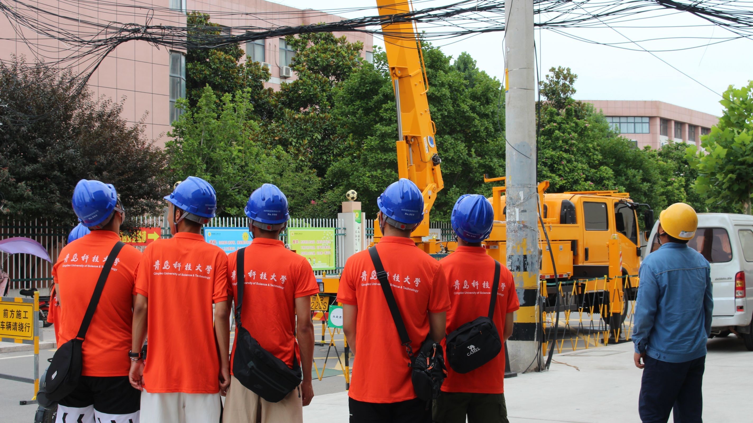 活动伊始,团队成员跟随国家电网的工作人员来到施工现场,在这里实地观察了工人们的带电作业。在团队成员与工人们的积极交流中,成员们了解到,为保证电力系统对用户的不间断供电,加强检修的计划性,不因检修而影响用户的正常用电,因此工人们通常进行带电作业,这样的工作方式不仅可以节省检修时间,减轻劳动强度,还能节约基建投资,简化操作。