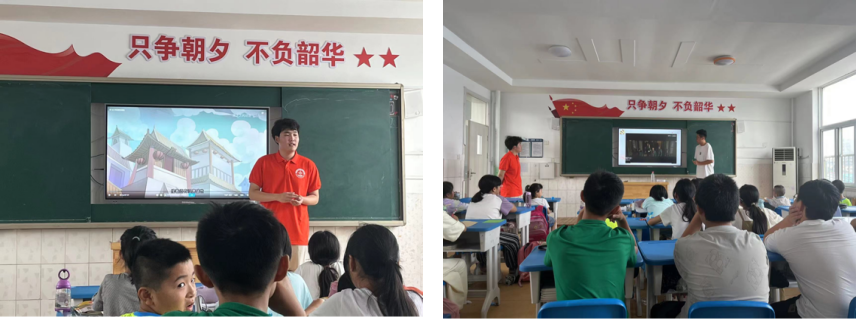 首先开展的是科学知识宣讲活动,以此来启发少年儿童科学素养,拓宽少年儿童科学知识面。就夏季降温方式、中暑预防措施及原理与学生们互动,帮助他们学习了解必备生活常识及背后的科学原理,激发他们对科学真理的好奇心,培养他们独立思考的能力,同时,在课堂上鼓励同学们积极发言,培养他们的自信心以及学习主动性。实践队员用精心的准备为学生们呈现一场别开生面的科学知识宣讲,以真挚的热情呵护他们对学习的渴望,在他们心中埋下一颗求真务实、探求科学真理的种子。