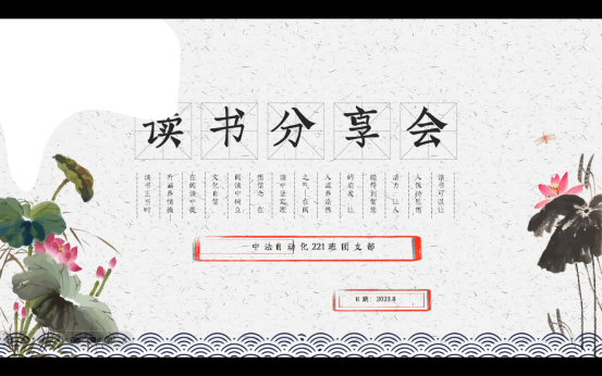 书是涵养静气的摇篮,是一种精神的跋涉。书或许不能解决眼下的难题,但会给你冲破困难的力量,让你哪怕深陷泥泞,也依然可以仰望星空。此次线上读书分享会活动旨在鞭策当代大学生保持良好的读书习惯,与同学们一起享受书带来的精神盛宴。中法自化221班团支部将坚持响应学校号召,引导同学们爱读书、会读书、好读书、读好书。书若流水,川流不息,潜移默化,润物无声。