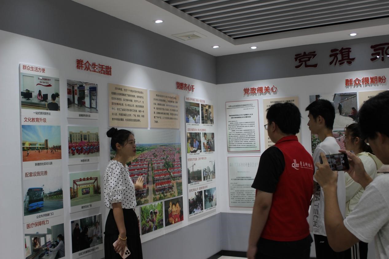 7月16日,团队跟随习近平总书记的脚步,来到了总书记曾探望过的董集镇杨庙社区。在社区工作人员的带领下,我们参观了社区历史文化展馆,学习了社区发展历史。可以看到的是,如今的杨庙社区,住房建设整齐划一,实行集中供暖、天然气入户、污水集中处理,配套建有便民服务中心、老年人餐厅、青少年之家等公共服务设施,居民人人都奔入了小康生活。在工作人员带领下,我们来到了总书记向社区居民讲话的地方,我们团队重温了总书记的发言,真正感悟到了总书记为经济发展、乡村振兴所付出的心血。