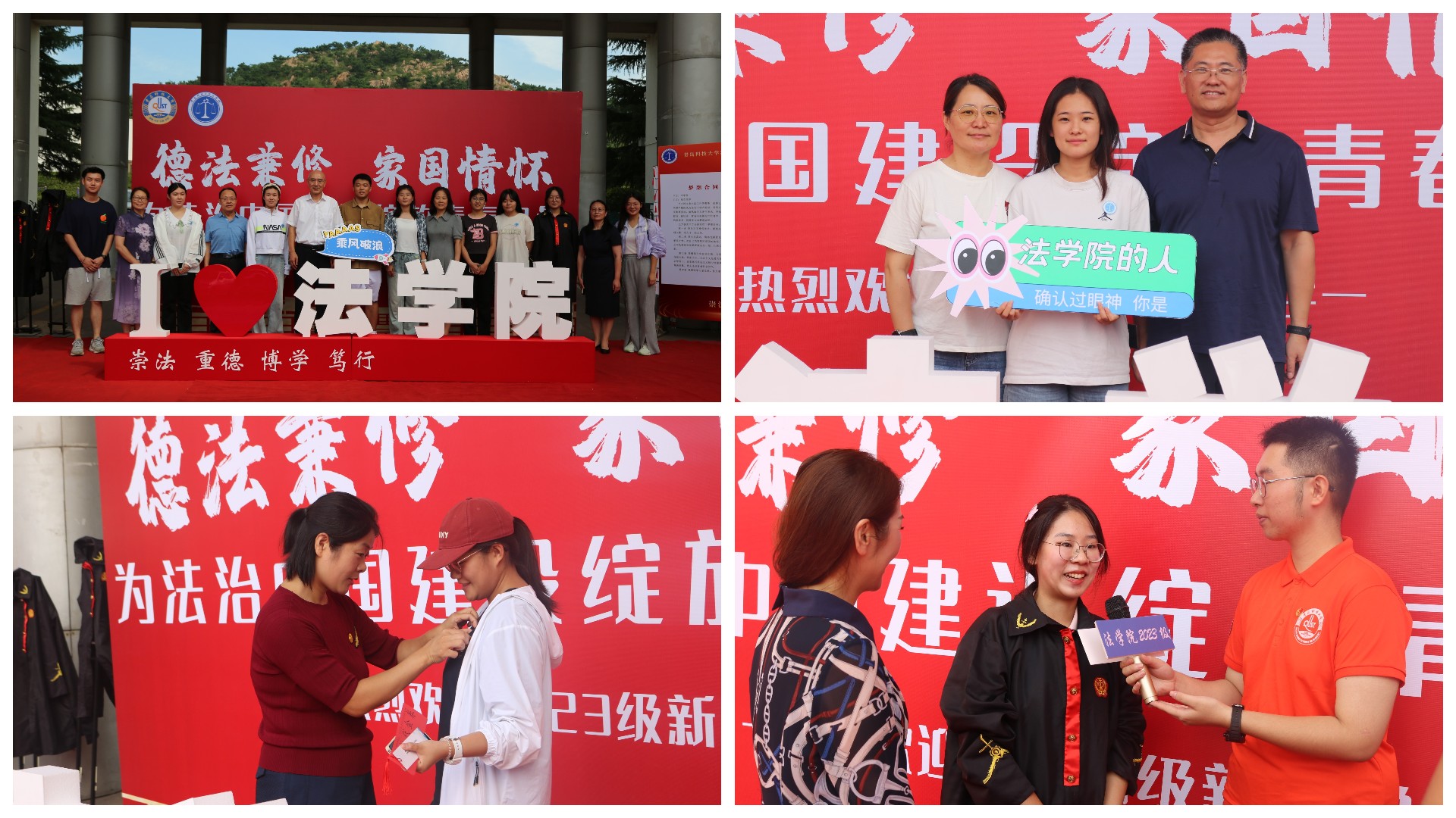 报到现场,学院还为新生准备了独家定制的印有学生姓名的专属院徽和书签,学院领导老师、辅导员为新生佩戴,并送上寄语和期盼。学院还定制了“我爱法学院”特色立牌,引来不少学生和家长驻足合影,进一步增强了学生的归属感和自豪感。“能进入法学院学习非常高兴,今天也感受到了学院对我们的关心和期望,希望大学四年学有所成,成为对社会有用的法治人才。”新生由默在采访时如实说到。
