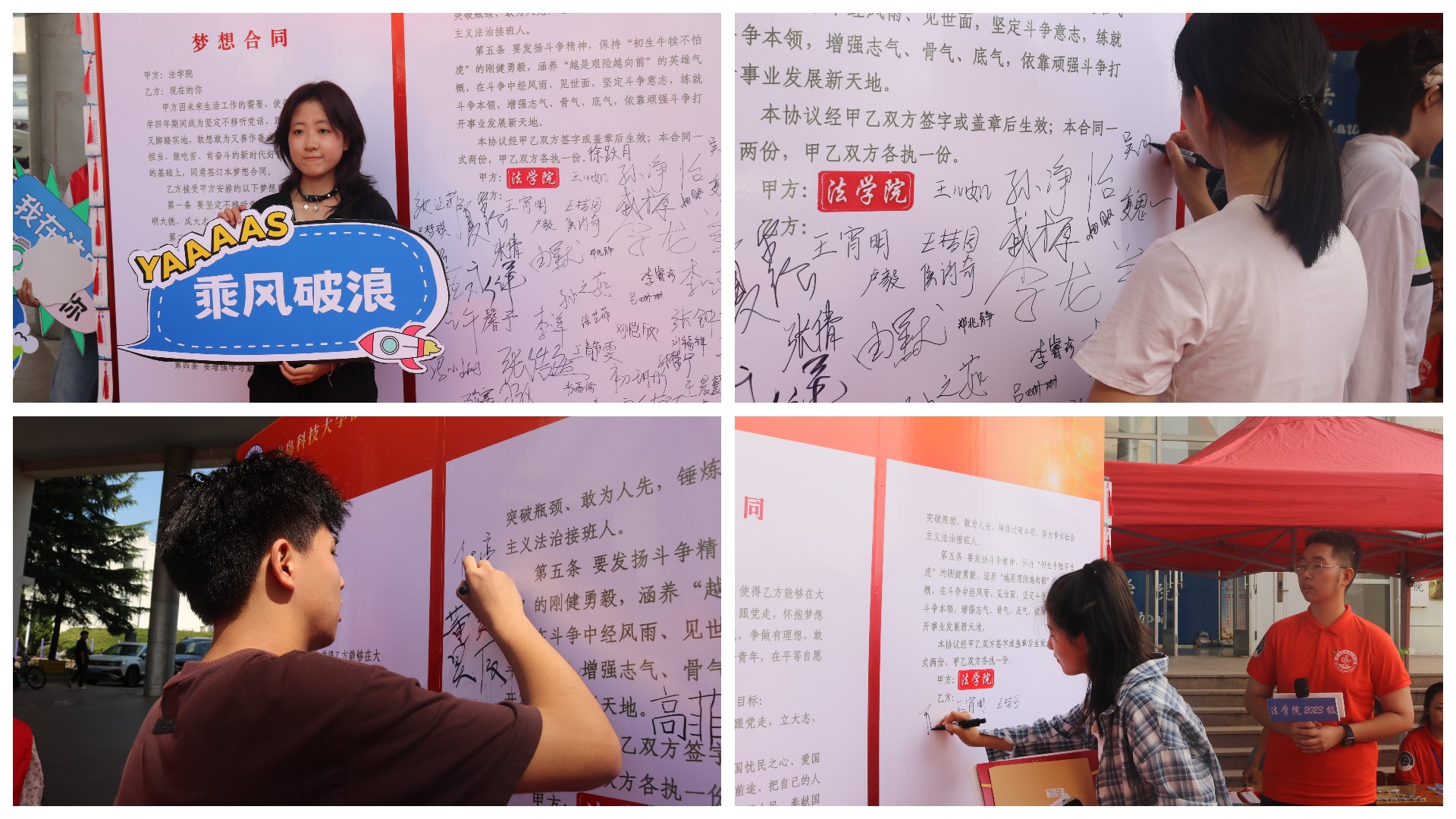 这份梦想合同书的甲方和乙方分别是法学院与“现在的你”,在家长和老师的见证下,新生在梦想合同书上签下自己的名字,引导法学新人们坚守《民法典》合同编中倡导的契约精神,承诺要立大志、明大德、成大才、担大任,德法兼修,厚植家国情怀,努力争当社会主义法治接班人。