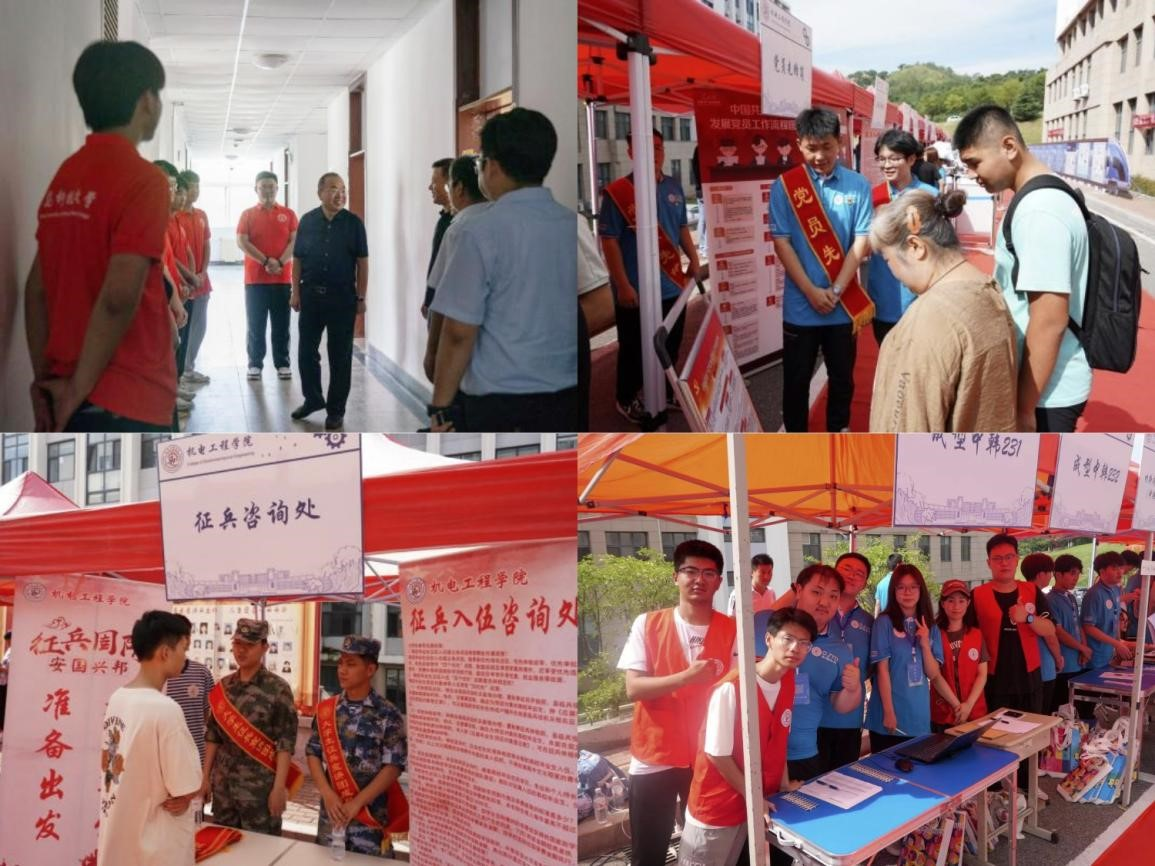 机电工程学院志愿者身穿蓝色志愿服,成为校园里一道靓丽的风景。200余名志愿者在志愿服务点尽职尽责,他们用精准周到的志愿服务迎接新生,用炽热之心传递志愿温暖,凝“新”聚力。学院自主组建新生接驳车队,运行李、接新生,为新生提供便利。本次迎新还招募了50名新生志愿者,尤其是徐玉航与徐玉泰这对“双胞胎”兄弟不仅努力配合记者的采访,而且积极参与学院迎新工作。同时学院志愿者船舶221张传涛同学带领新生志愿者参观学校,分别拍摄迎新志愿者的一天、领航的一天和新生报到的一天vlog视频,以“老带新”、“新带新”传、帮、带的形式帮助新生尽快适应大学生活。迎新现场,设置“党员先锋岗”,由党员志愿者为新生及家长讲解入党流程,鼓励新生向党组织靠拢,强化思想引领;设置“强军有我”征兵宣讲团,致力于增强学生家国情怀和国防意识,激发学生们主动肩负历史责任、践行时代使命的责任与担当;设置2021-2023年连续三年考研光荣榜,充分展现朋辈风姿和学院人才培养成果,引领新生以奋斗者的姿态继续前行,将“学在科大”的种子牢牢根植在学生心中。