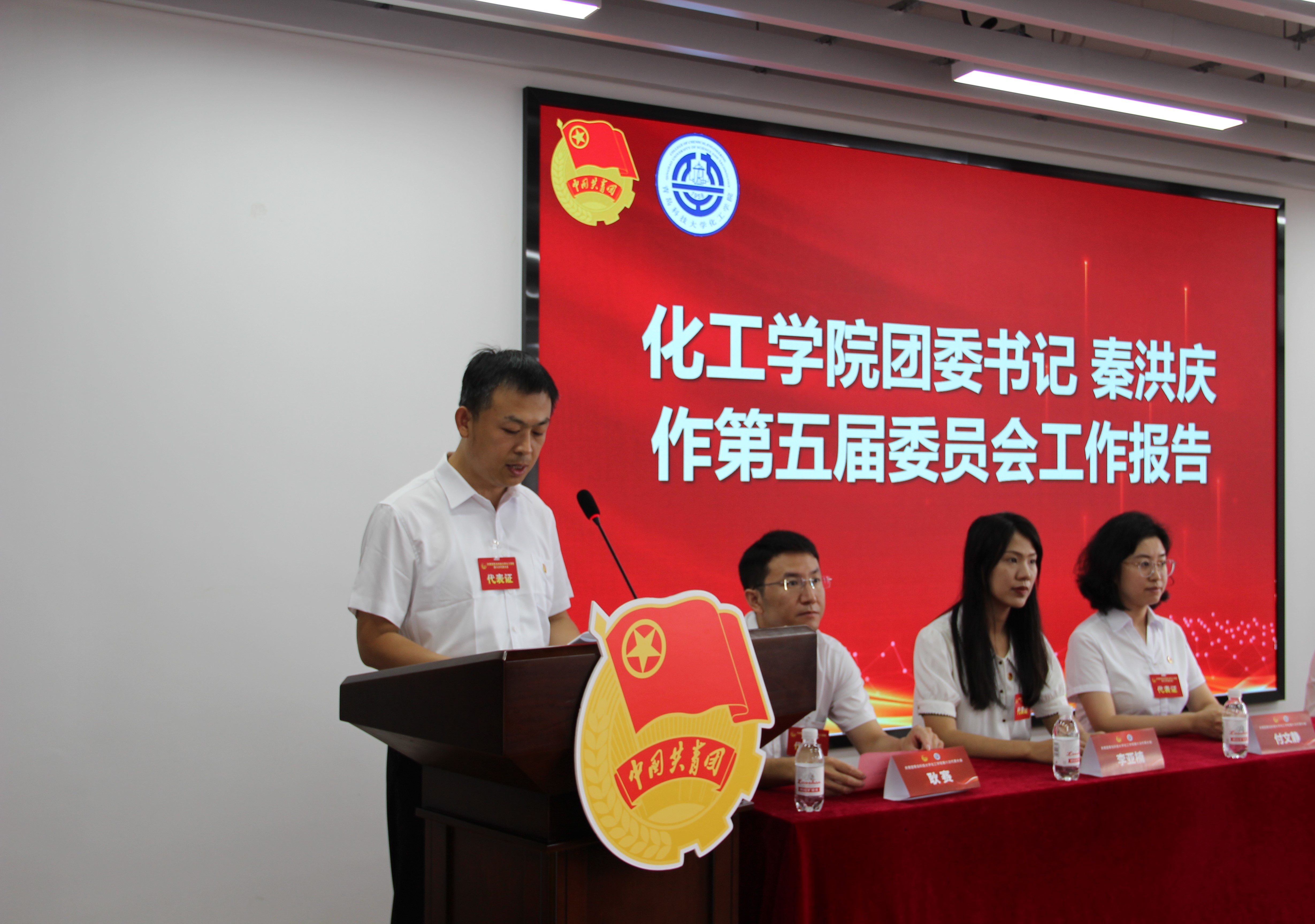 秦洪庆代表共青团万象城allwincity官网化工学院第五届委员会作了题为《高擎旗帜跟党走,踔厉奋发新征程 努力开创化工学院共青团工作新篇章》的工作报告。