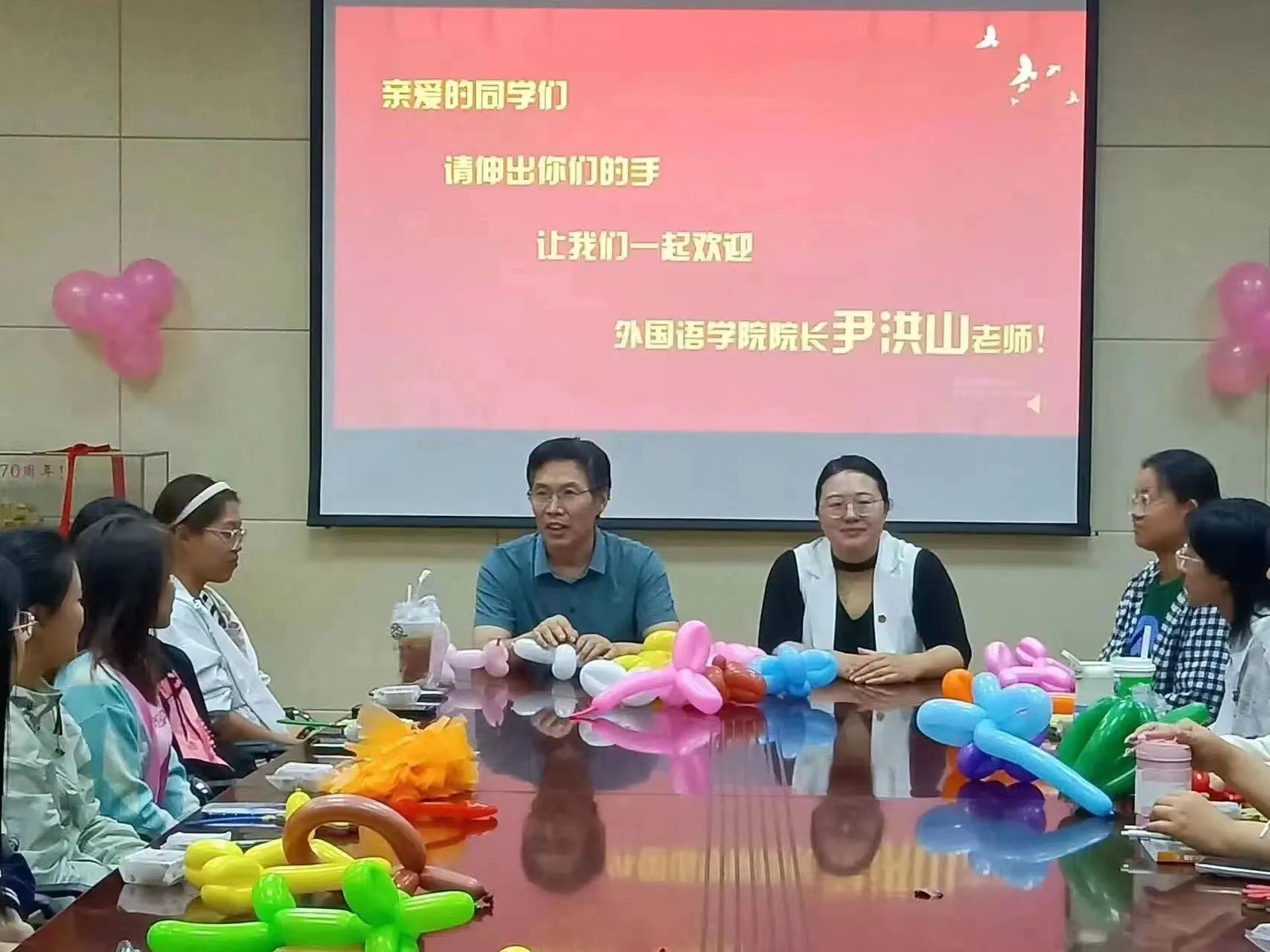 在中秋国庆双节到来之际,外国语学院组织举办“欢度双节”茶话会,学院院长尹洪山、学工办主任兼团委书记刘妍君出席活动,尹洪山院长在活动上为同学们送上节日祝福并就学生的学习和生活以及如何利用好假期提出几点愿景。在活动中外国语学院为同学们准备了月饼和零食,开展了系列小游戏,同时进行了《我和我的祖国》观影活动,活动中感受到了浓浓的节日氛围和爱国情怀。