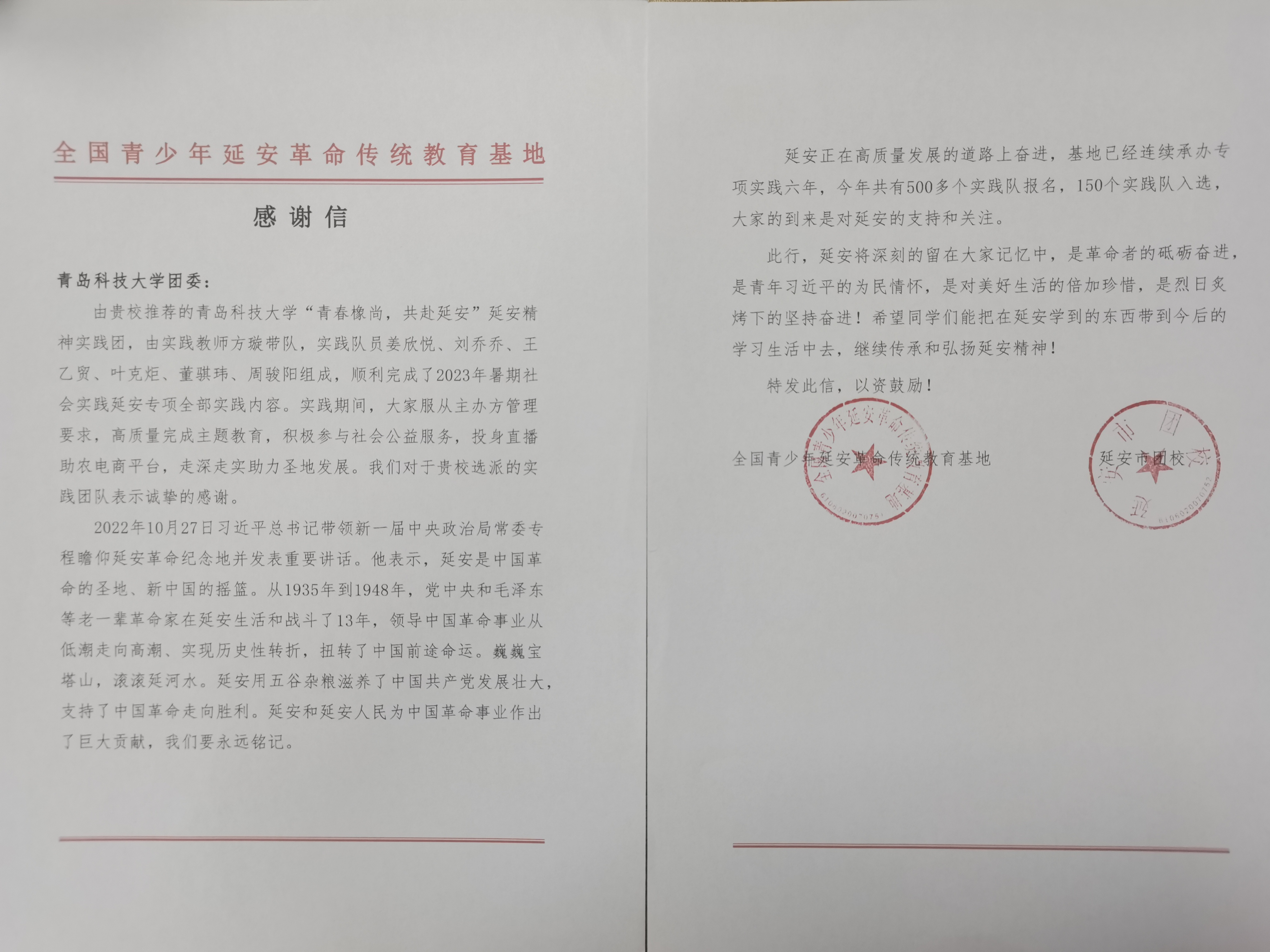 日前,全国青少年延安革命传统教育基地、延安市团校向万象城allwincity官网高分子学院发来了感谢信,对学院学子在延安开展社会实践表现出的奉献精神与责任担当表示衷心感谢。