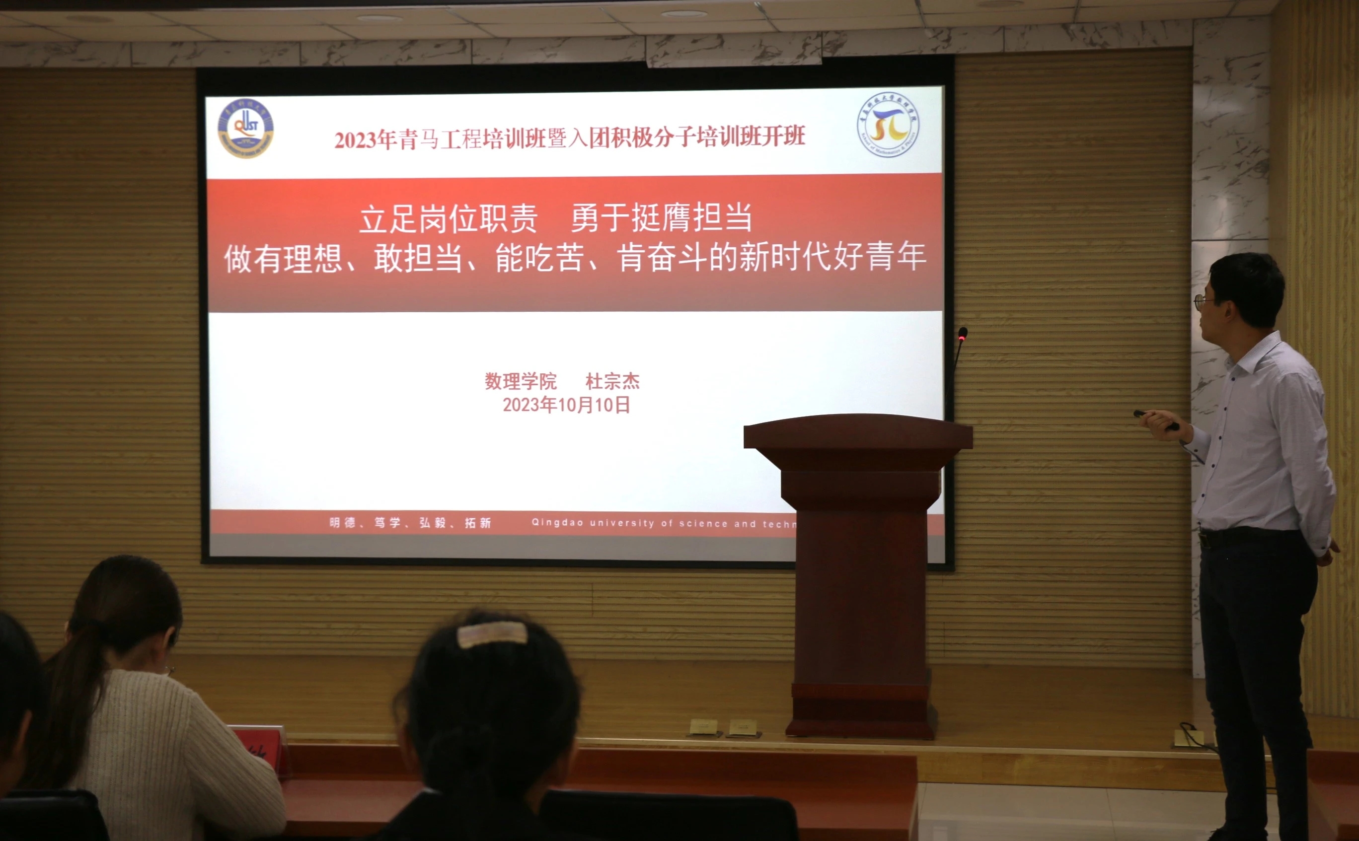 仪式过后,杜宗杰作出开班第一讲,以“立足职责岗位,勇于挺膺担当,做有理想、敢担当、能吃苦、肯奋斗的新时代好青年”为主题,带领全体参会人员学习了习近平总书记在哈尔滨工程大学考察时的重要讲话精神。讲话中指出,激发科技创新的青春力量,要继续在“选苗”上下功夫,要进一步厚植人才培养的“土壤”,还需要更多“阳光雨露的滋润”。