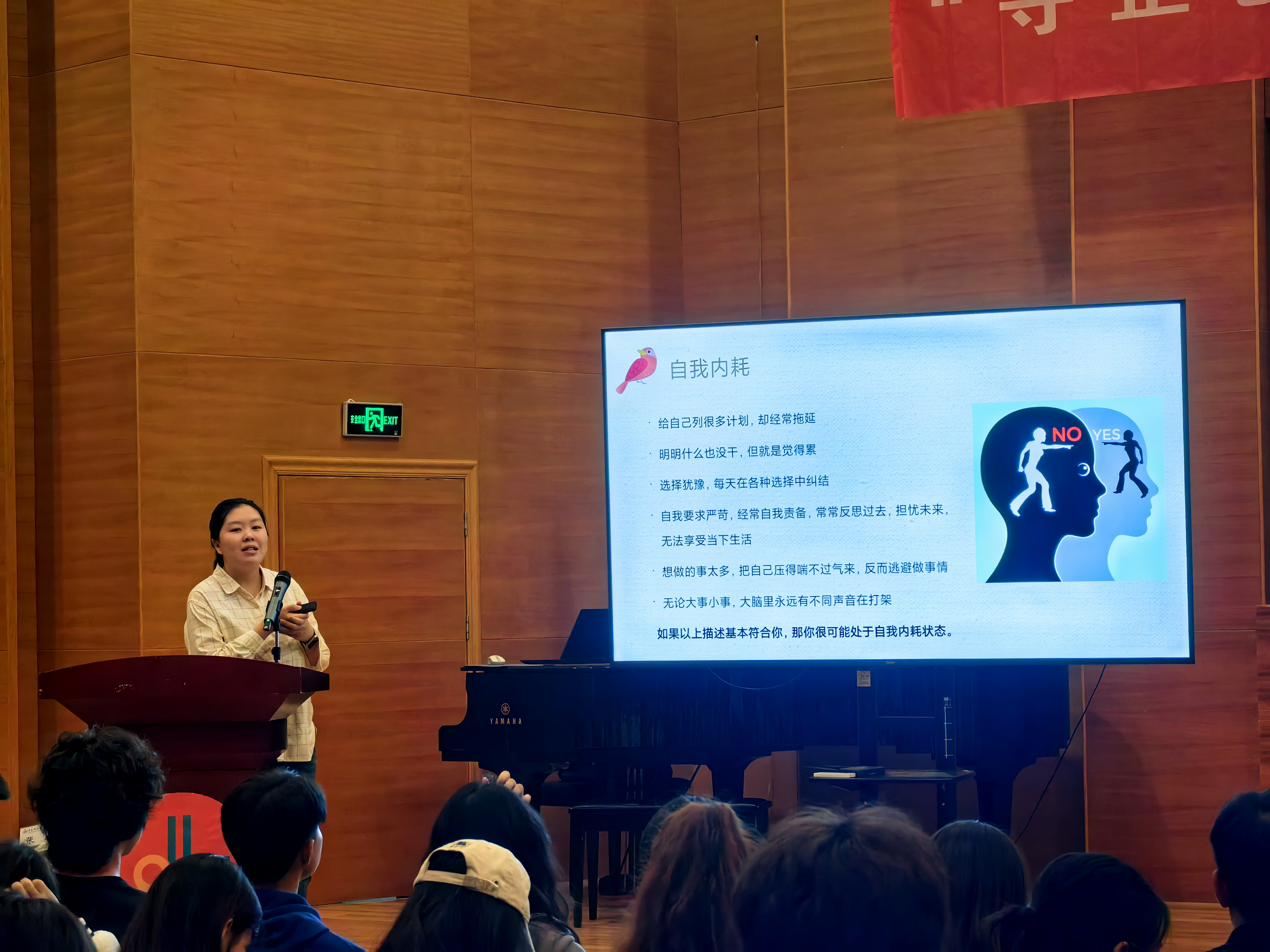 宋晨曦以“关爱自我、健康成长”为主题,从自我内耗的状态、方法两点进行解释,她鼓励团学干部们要珍爱生命,觉察自身情绪,学会调节自我。