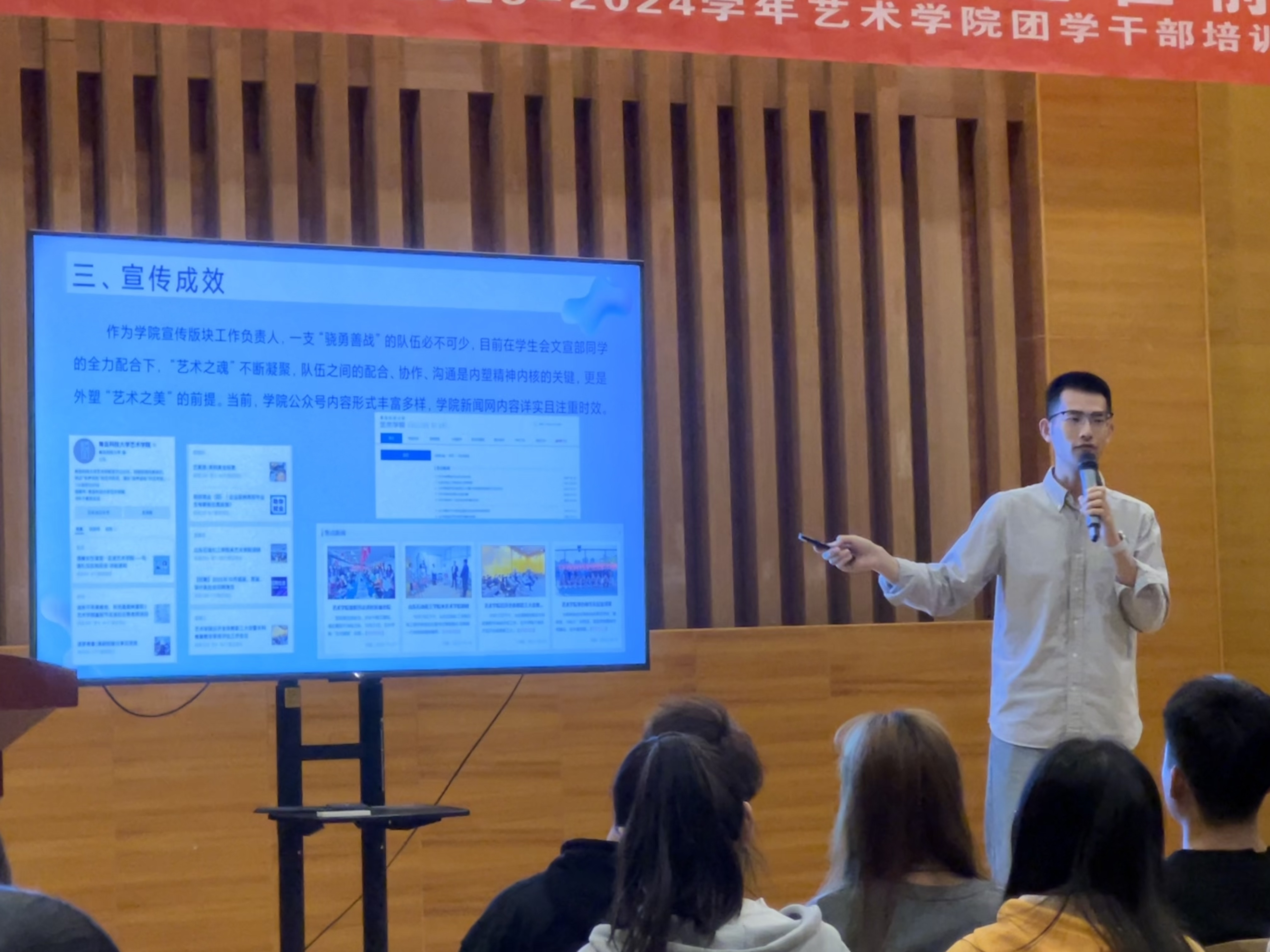 杨橙以“宣传工作如何内塑艺术之魂,外塑艺术之美”为主题,介绍了学院新闻网、公众号等从构思、准备、参与、撰写、发布的全过程,号召全体团学干部积极构思、努力参与学院的宣传工作。