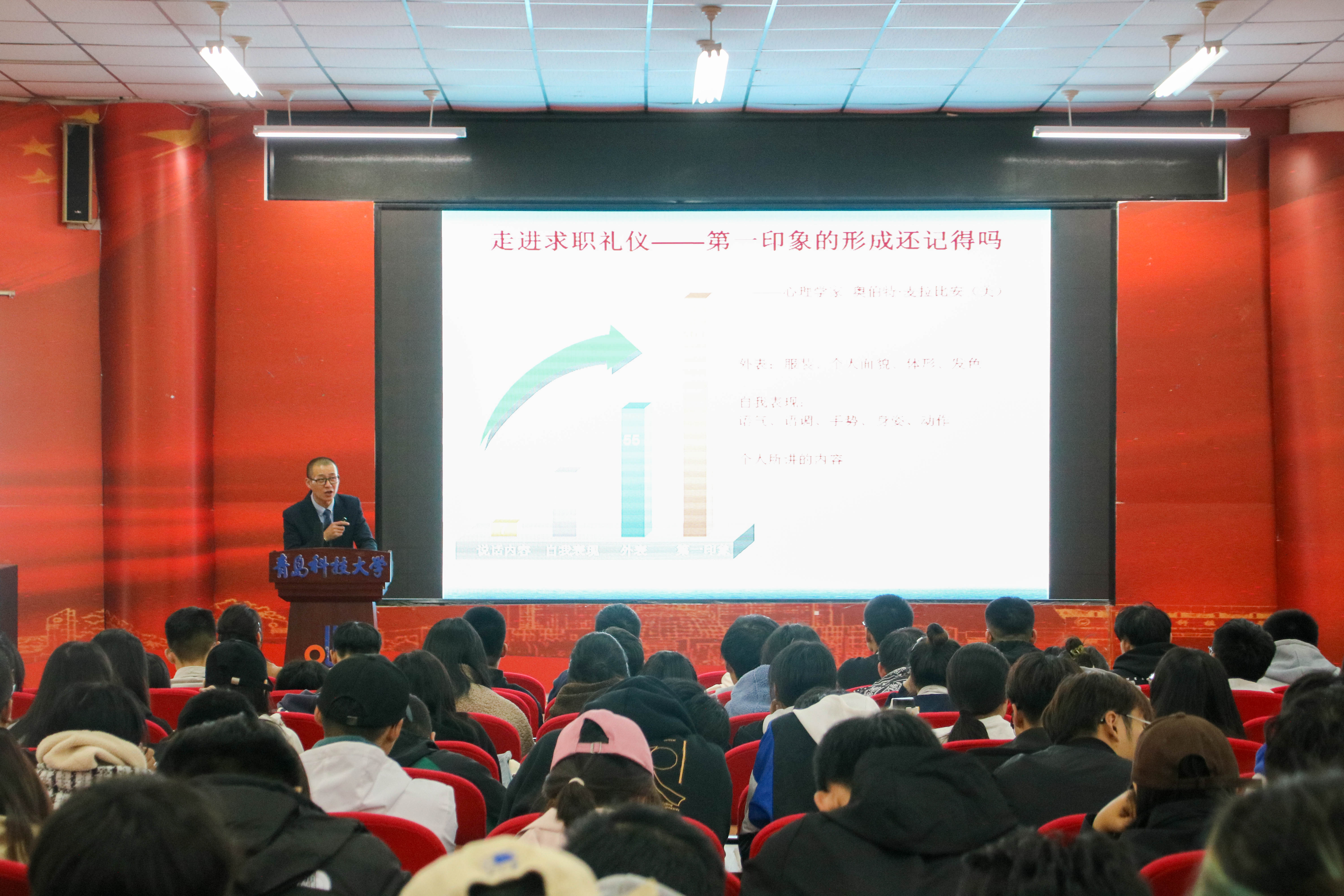 讲座伊始,杨洋老师强调礼仪就是细节,礼仪就是敬人谦己。他主要从求职形象设计外的准备,形象设计准备、面试全流程解析三个方面,用生动的语言,充沛的情感,活泼的授课方式为学生讲授了求职前、求职中、求职后的职场礼仪。杨老师指出,在求职时要精心制作求职简历和求职信,整理个人经历并练好手写签名,锻炼在公众面前用普通话表达自己思想等能力;在形象设计准备上要注意手表、西装、领带或丝巾、衬衫、发型等个人形象的打理;最后,他从投递简历和求职信、收到面试通知、出发前的准备、面试等7个方面进行了面试流程解析。