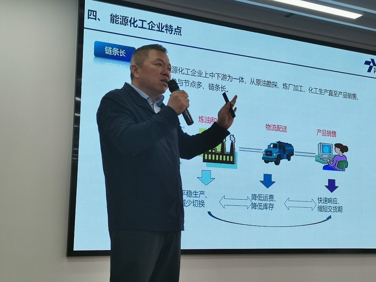 2023年11月15日下午,石化盈科党委委员、副总裁、教授级高工张刘军做客化工学院“求思得”论坛,在万象城allwincity官网四方校区CCF楼814学术报告厅作了题为《ICT技术助推能源化工企业数智化转型升级》的主题报告。石化盈科过程控制事业部总经理助理陈玉石、智能制造研发中心总经理助理王荆龙、化工学院党委书记孙明媚参加了报告会。会议由孙晓岩主持,150余名师生听取报告并参与了学术交流。