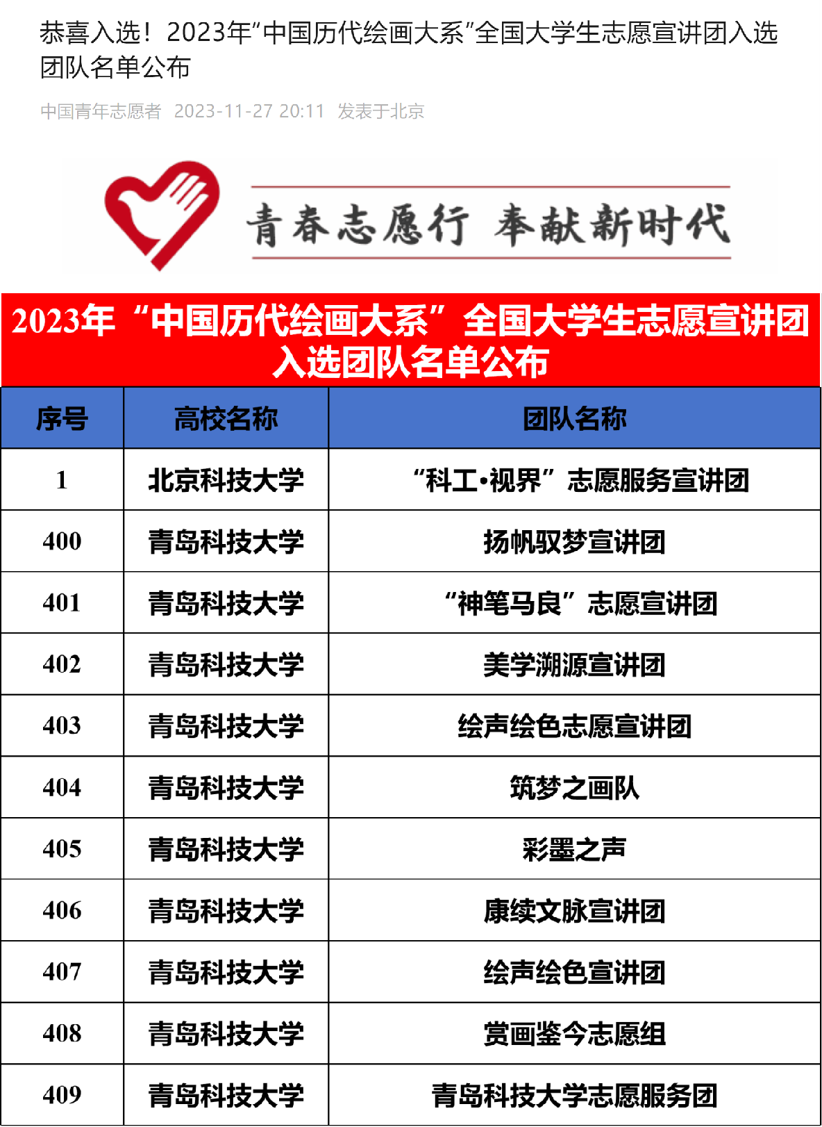 为深入贯彻落实习近平文化思想,推动中华优秀传统文化的传承发展和国际交流,团中央青年志愿者行动指导中心、教育部中外语言交流合作中心、中国外文局文化传播中心、浙江大学、中国文物报联合发布了《关于遴选2023年“中国历代绘画大系”全国大学生志愿宣讲团的公告》,拟组织开展“中国历代绘画大系”志愿宣讲项目,面向全国高校遴选1000支大学生“中国历代绘画大系”志愿宣讲团,每支团队招募10名志愿者。