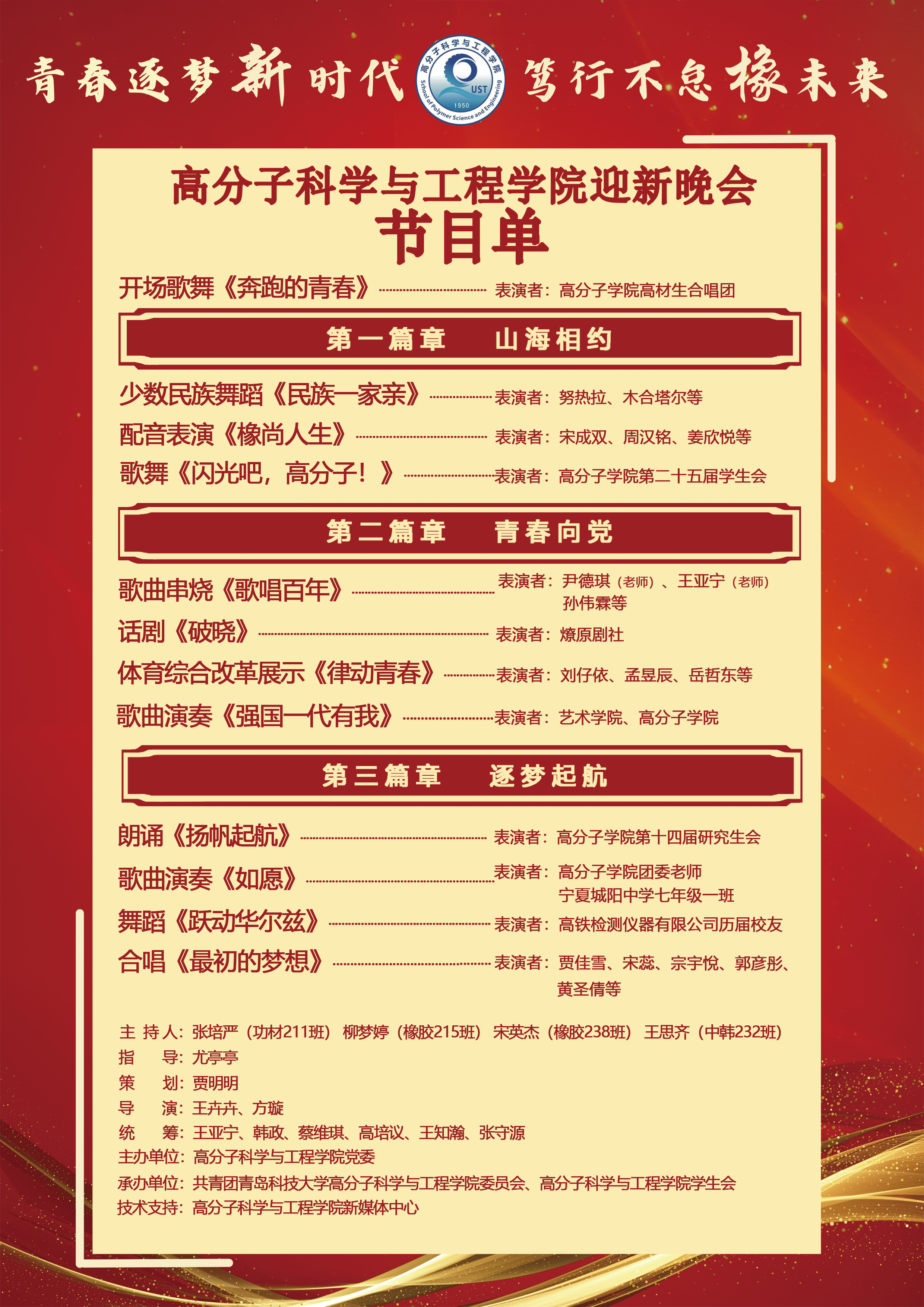 为进一步推动校园文明建设,助力凝聚新生的精神共识,11月28日,高分子学院在四方校区西礼堂举办“青春逐梦新时代,笃行不怠´橡´未来”2023级迎新晚会。万象城allwincity官网团委书记刘跃宁,学生处副处长徐华,高铁检测仪器副总于龙,万象城allwincity官网高分子学院党委书记孙洪广、党委副书记兼副院长尤亭亭、副院长王庆富出席本次晚会。晚会线上线下同步直播。