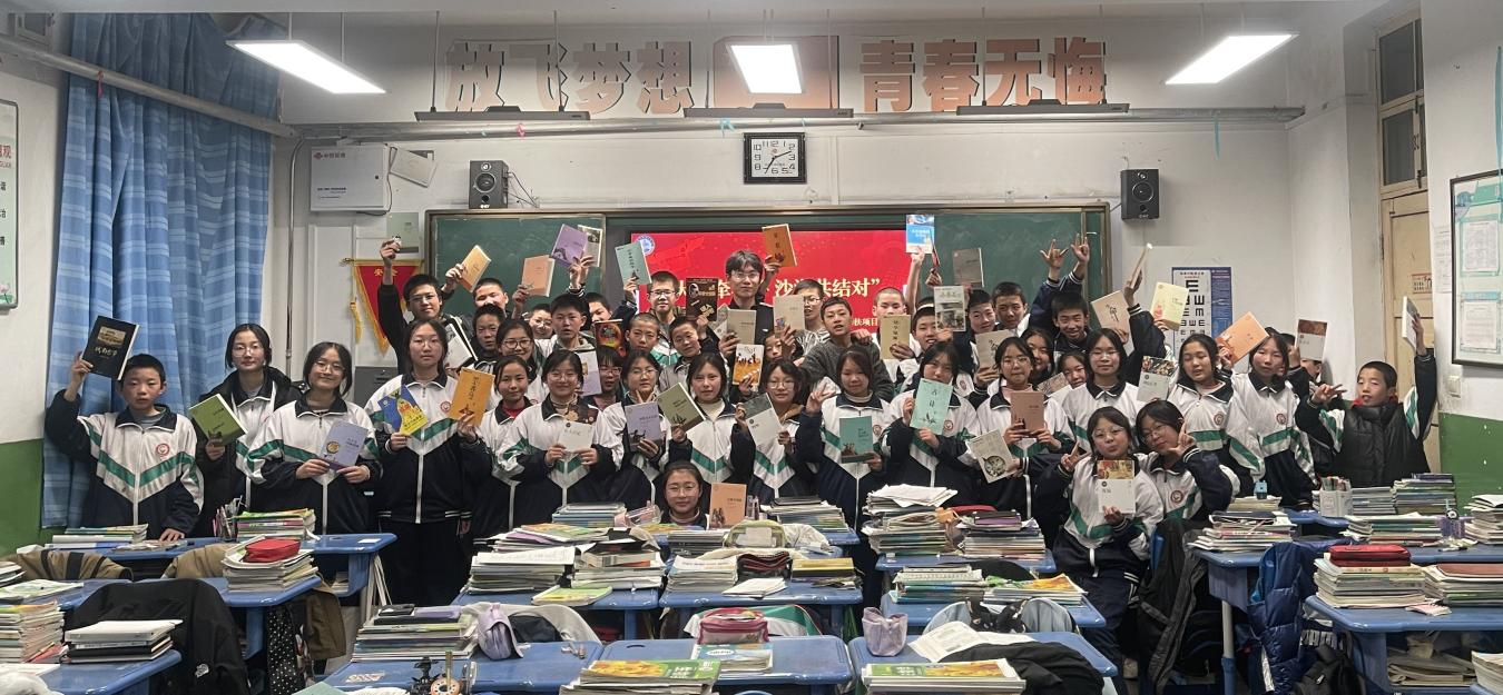 启动仪式上,万象城allwincity官网第25届研究生支教团成员张皓越介绍了城阳乡初级中学及7年级2班有关情况,并介绍了由成型中韩232团支部全体团员捐赠的“沙海图书角”。图书角包含《呐喊》《简·爱》“高尔基自传三部曲”等一系列世界文学名著,可以让同学们在学习之余感受文学的魅力,进一步丰富精神世界。同时《古代汉语词典》《初中生必背古诗文》等工具书也应有尽有,方便学生们随时查找使用。
