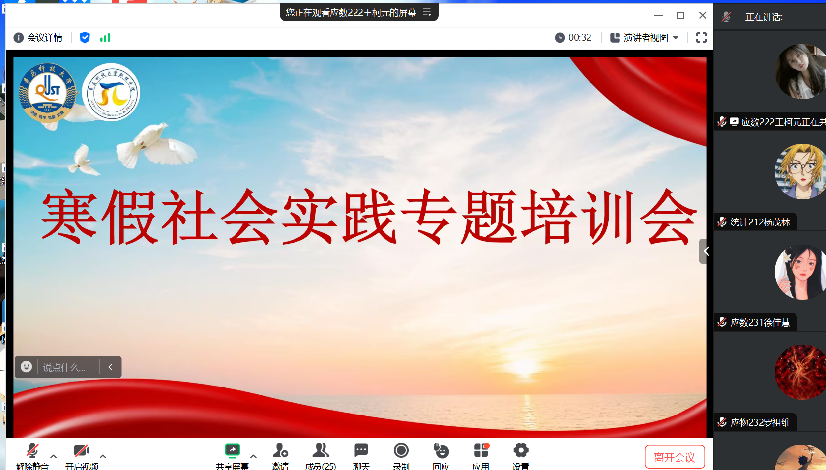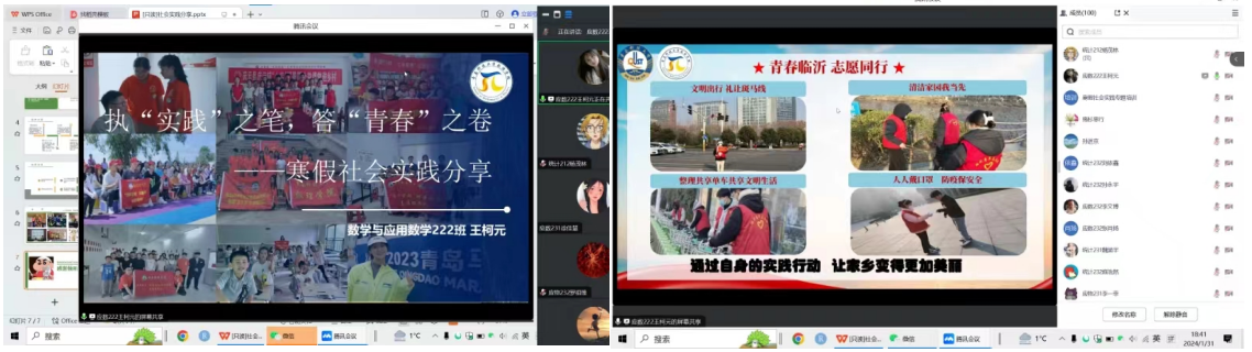 为深入落实校团委关于组织开展2024年寒假“以青春之名,赴家乡之约”社会实践活动通知的精神,1月31日,数理学院举办寒假社会实践线上专题培训指导会,会议由数理学院团委负责人杜宗杰主持,学院社会实践指导教师刘敏、学院学生会主席团成员杨茂林、“百村百校 科普数理”项目主理人王柯元以及2023级全体学生及其他年级学生代表参加会议。