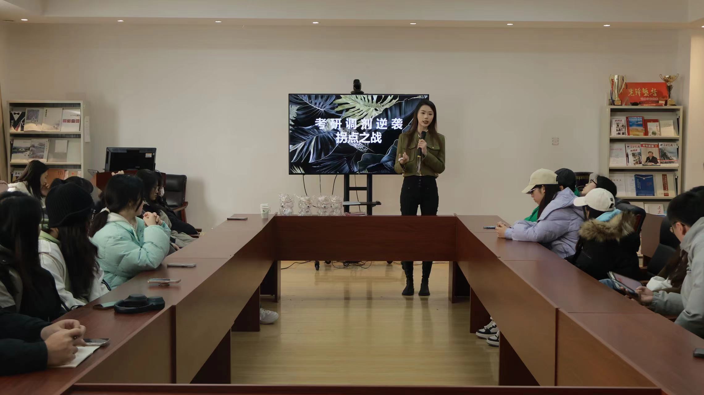 陈露以“考研调剂逆袭拐点之战”为主题,她首先对考研复试、调剂流程进行了介绍,她强调,同学们要抢占先机,从现在到复试阶段的各项重要时间节点均要了然于心,并调整心态,充分挖掘各类相关资源。她结合经验给予同学三方面建议:一、无论个人性格在生活中多么含蓄内敛,在复试阶段都要放开,去大胆争取,提前联系导师;二、复试现场在导师、团队面前,要围绕自己的执行能力、学习能力、科研能力去着重体现;三、在各大社交、媒体、官方平台搜集各项信息,关注考研“红黑榜”,有时候选择要大于努力。现场同学们就关心的复试与调剂问题积极提问,陈露根据大家的初试情况提供了具体建议,并提醒同学们精心、细心、用心做好各项准备,祝福大家都能顺利开启自己的研究生生涯。