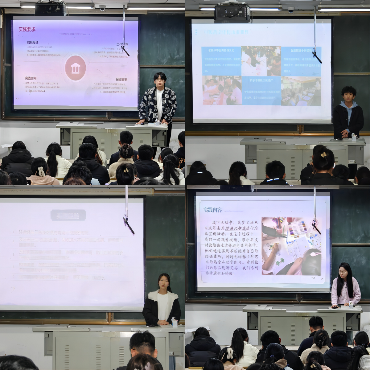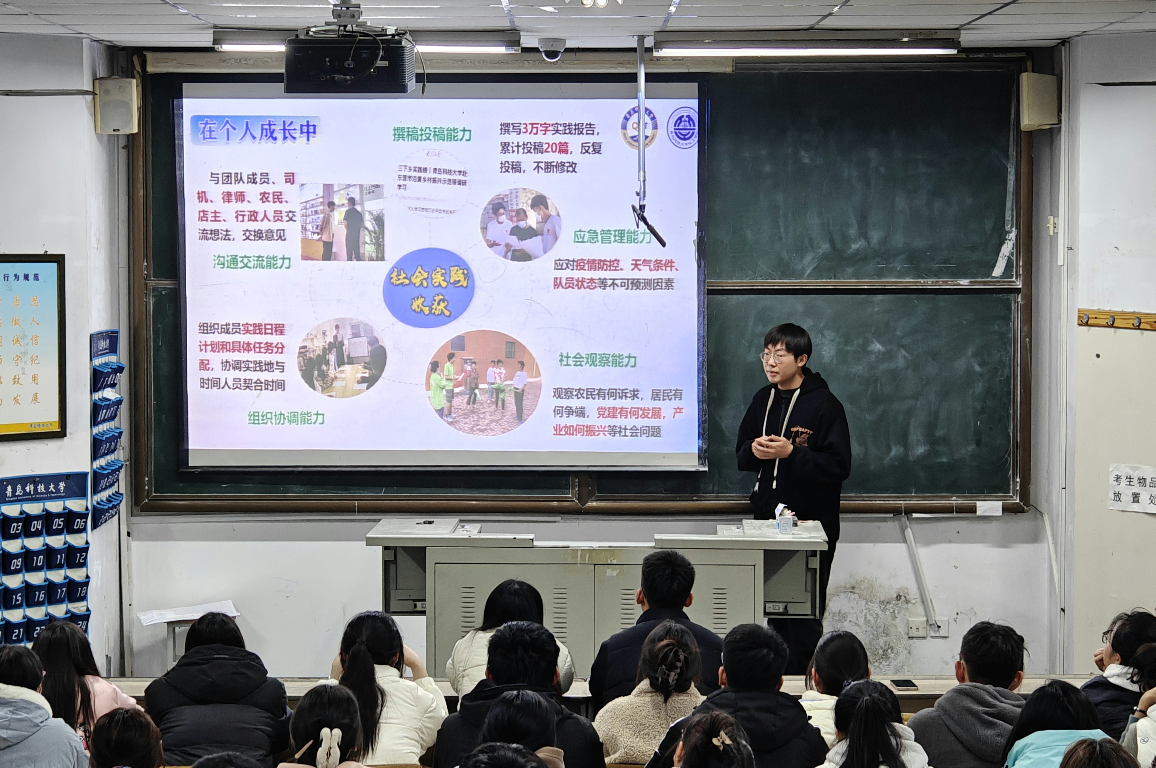 各实践团队代表们从实践地点、类型、方法全方位地展现了在社会实践过程中团队积累的宝贵经验与收获,交流了自己在实践期间的观察、体验和感悟。在活动中,保送四川大学的鹿庆阳学长给大一、大二年级的同学们分享了从社会实践活动助力自身成功保研的经验,讲述了自己在保研申请过程中,各个高校申报表中社会实践均被列为必填项,鼓励学弟学妹们躬身社会实践,将理论应用于实践,积极开展各类型的社会实践活动。