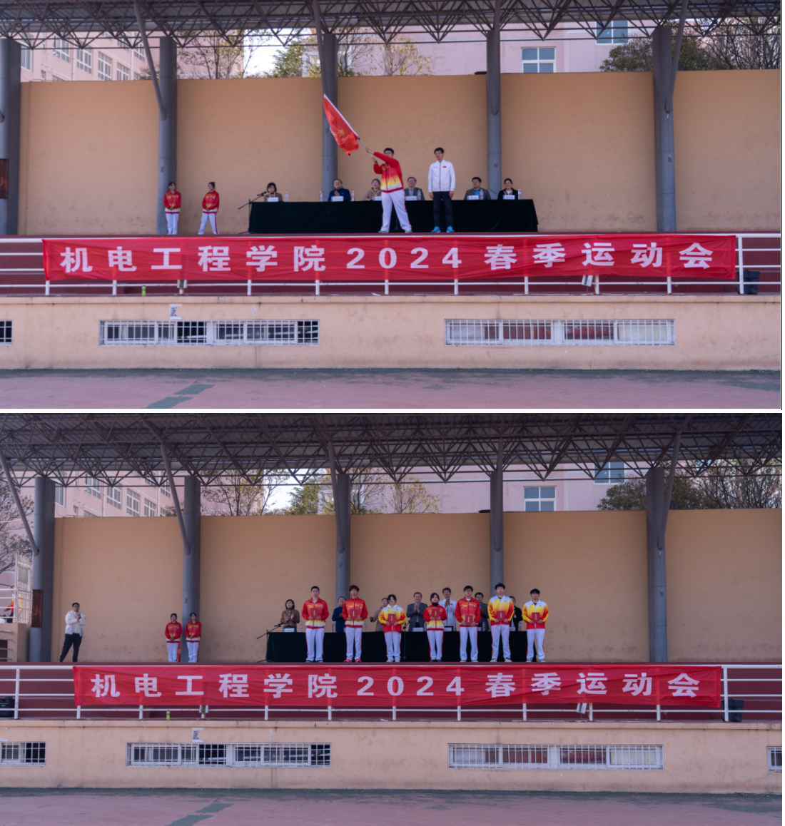 开幕式上,与会嘉宾为2023年度体育达人和体育工作先进集体颁奖,楚晓东为学院田径队授旗,裁判员代表和学生运动员代表进行宣誓。开幕式现场进行了体育舞蹈、花样跳绳、武术套路展演,展示了“爱体育、兴科大”学练成果。开幕式还进行了“液体黄金”运动季启动仪式,随着一声令下,与会嘉宾与青年学生穿着“液体黄金鞋”,尽情挥洒汗水,形成了春日一道靓丽的风景线。2024年春季运动会设置了拔河、短跑、接力、跳高、扔铅球等运动项目,吸引了全院学生广泛参与。