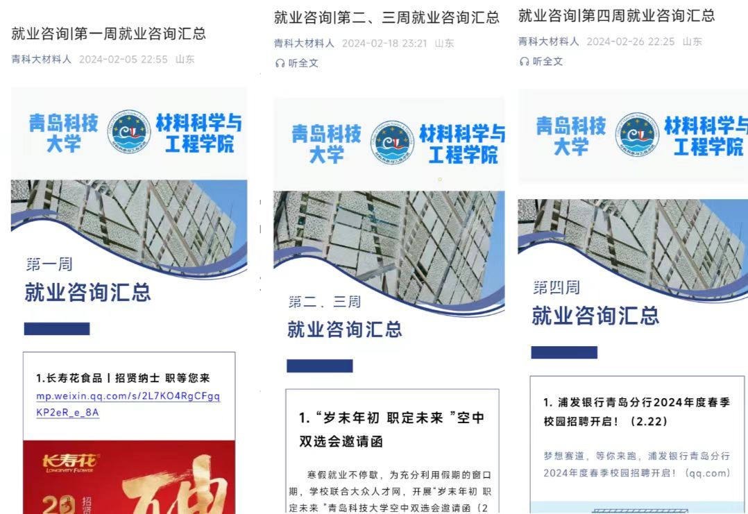 学院团委组织一批有经验的学生团干部与2024届毕业生进行结对,深入了解结对学生专业背景、兴趣爱好、职业规划等,制定个性化的帮扶计划。在就业帮扶线上活动中,我院于微信公众号-青科大材料人设置专门就业咨询专栏,通过线上平台发布就业信息,帮助毕业生了解并整合最新的就业信息;依托春季校园招聘会,发挥“三色雁阵”党员先锋岗先进作用,学院学生党员在招聘会中积极担当,跟进帮扶对象就业情况,展现党员责任与担当。