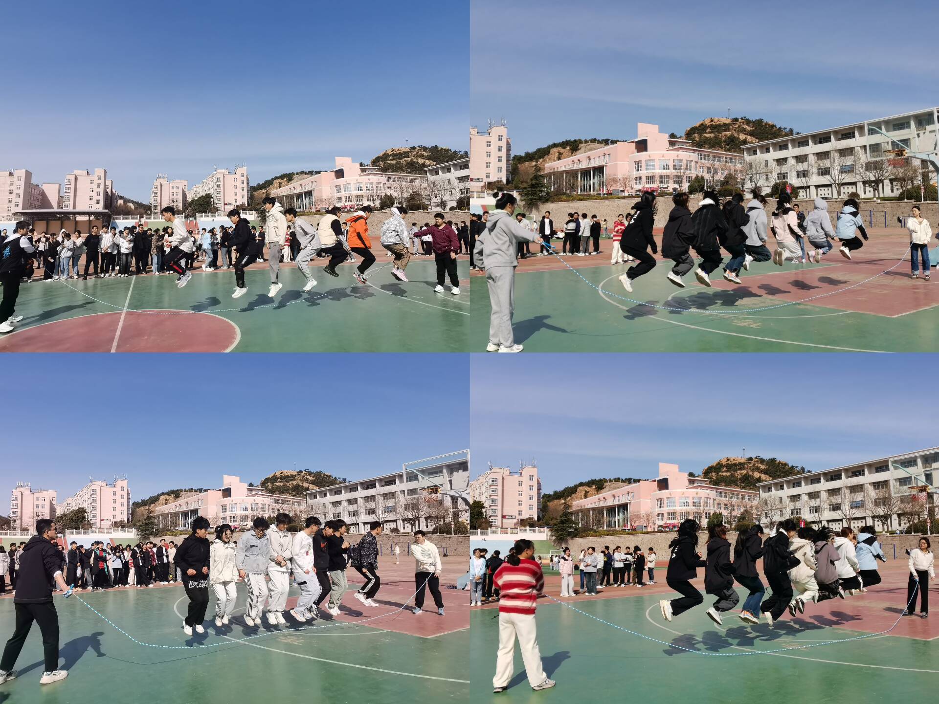 3月31日上午,信息学院团委在崂山校区南苑田径场举办 3月份“青春速度”院级联赛。本次联赛项目为十人一字集体跳,要求在1分钟内,2名运动员同步摇动长绳,其他8名运动员集体在绳中跳绳,绳子同时通过8个人头顶和脚下,并尽可能多地完成集体跳绳次数。此项目为学院花样跳绳的优势项目,曾在多次在校赛中取得优异成绩。比赛现场激烈又和谐,大多数队伍的两名摇绳选手配合默契,把握节奏,跳绳选手则心无旁骛,有条不紊,选手们共同描绘出一幅活力十足的跳绳画面。经过两个小时的激烈角逐,比赛落下帷幕。