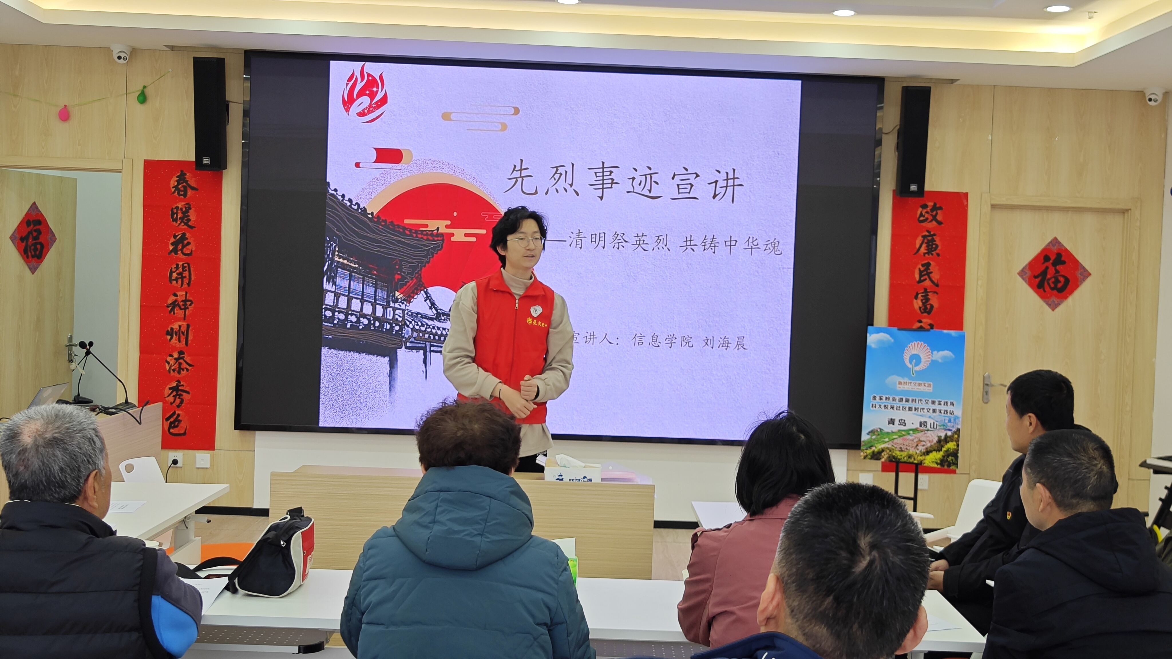 缅怀革命先辈,弘扬先烈精神。信息学院星火“e+”学生志愿者于4月3日在科大悦苑社区组织开展“先烈事迹”宣讲活动,志愿者与群众居民共同交流先烈事迹,表达对革命先烈的敬畏之情。之后,志愿者向社区群众讲述文明祭祀的相关规范要求,倡导文明祭祀新风,鼓励社区群众做文明祭祀的先行者、带头人。