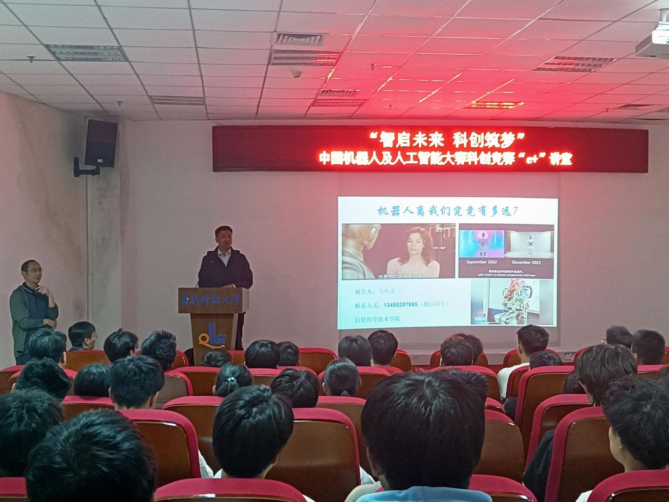 为加强学生激发学生对机器人和人工智能的兴趣,提高学生对中国机器人及人工智能大赛的了解和参赛积极性,4月17日,高密校区团委在图书馆东报告厅举办了“智启未来 科创筑梦”科创“e+”讲堂。讲堂邀请了第二十六届中国机器人及人工智能大赛校赛负责人马兴录担任主讲,计算机系系主任宋廷强、多位教师和100余名学生参加。