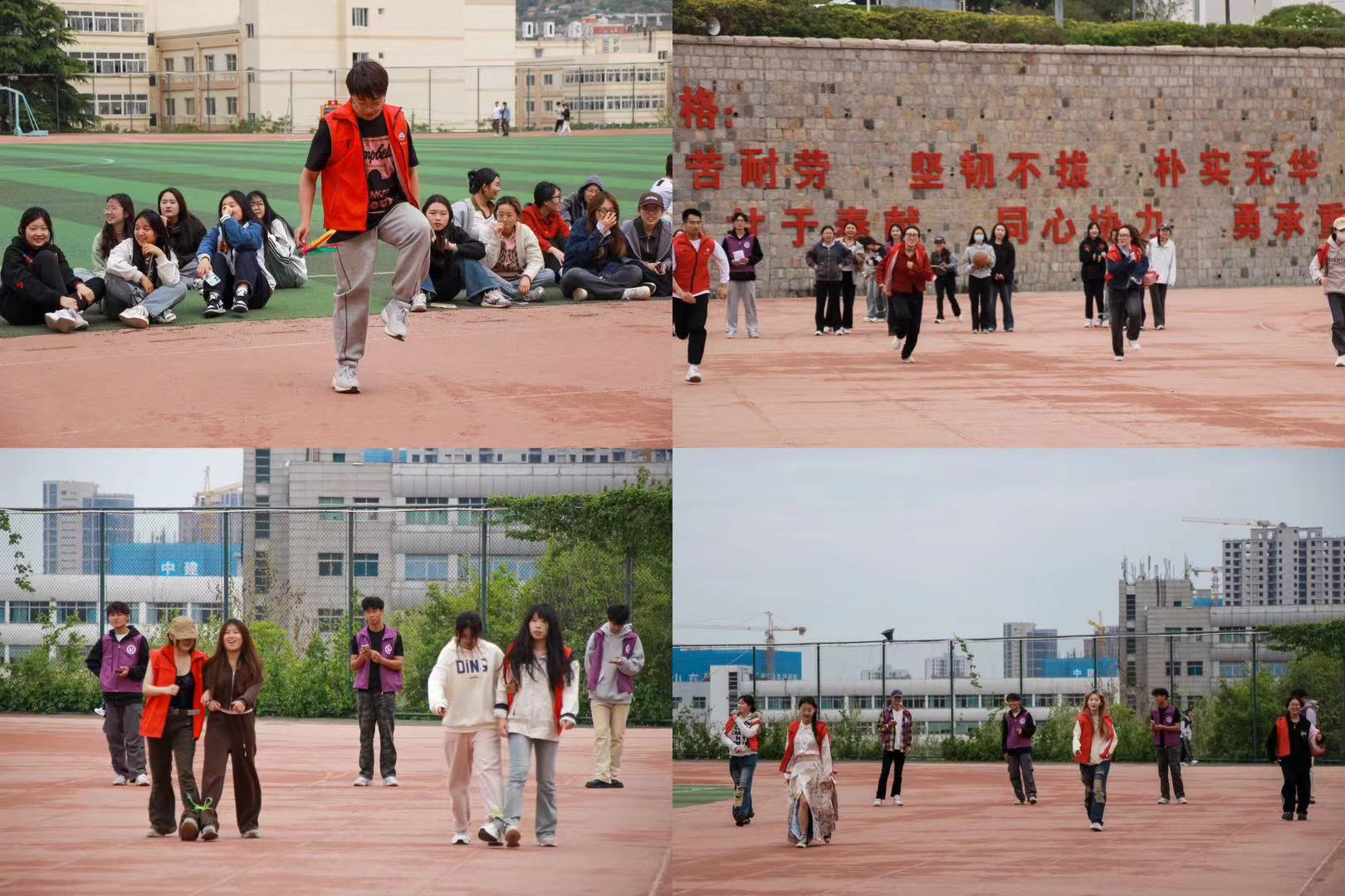 活动伊始,学生代表高举院旗,全体师生围绕操场进行健康跑打卡。接下来,辅导员老师们纷纷加入赛场,与同学们有序组队、默契配合,接力完成踢毽子、拍球速跑、竞走和两人三足等项目,每个竞赛项目都充分体现运动性、趣味性和挑战性的高度融合。
