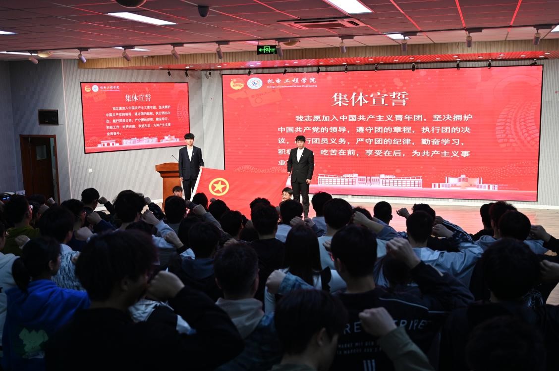 4月28日,机电工程学院团委在机电530会议室开展“青春奋力向党,挺膺担当筑未来”2023年新发展团员入团仪式,学院党委副书记兼副院长杨小明,学院团委教师代表出席,团支部书记代表、优秀团员代表以及2023年新发展团员参加本次仪式。