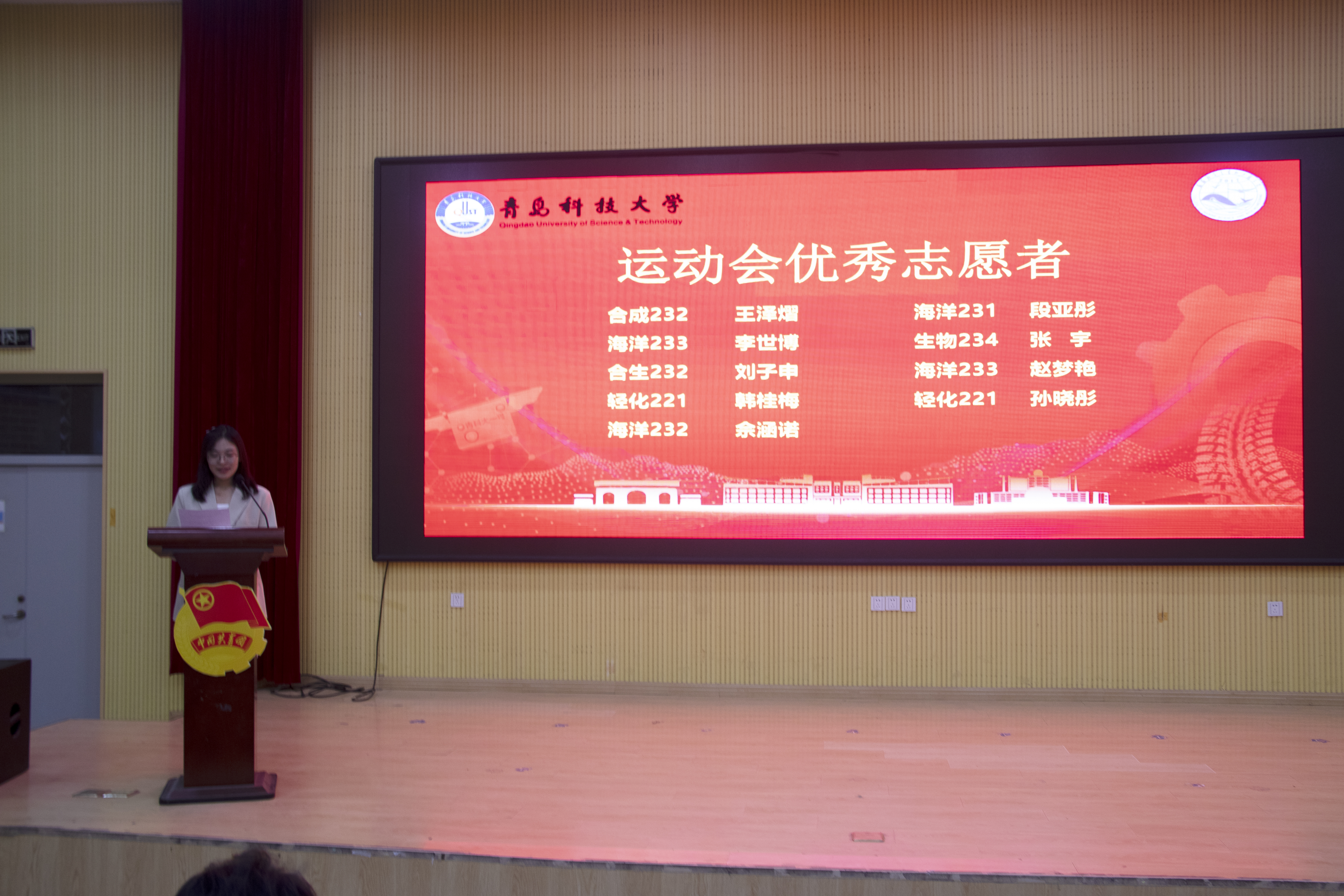 为积极培育和践行社会主义核心价值观,大力弘扬“奉献、友爱、互助、进步”的志愿者精神,表彰在过去的一年中在志愿服务和社会实践中表现积极的青年志愿者;同时,为表彰海院学子在校运动会中的突出表现,鼓励海院学子弘扬体育精神,勇担时代大任,争做有为青年。5月14日,海洋学院团委于尚舜报告厅举办“青春恰似火,奋斗正当时”优秀志愿者颁奖仪式暨运动会表彰大会,海洋学院党委副书记兼副院长刘浩、扬子江药业集团青岛地区负责人刘颖、海洋学院学工办主任兼团委书记秦洪庆、团委老师吕珊珊、车玉章、郭颖和学生代表参加活动,大会在庄严肃穆的国歌声中拉开序幕。