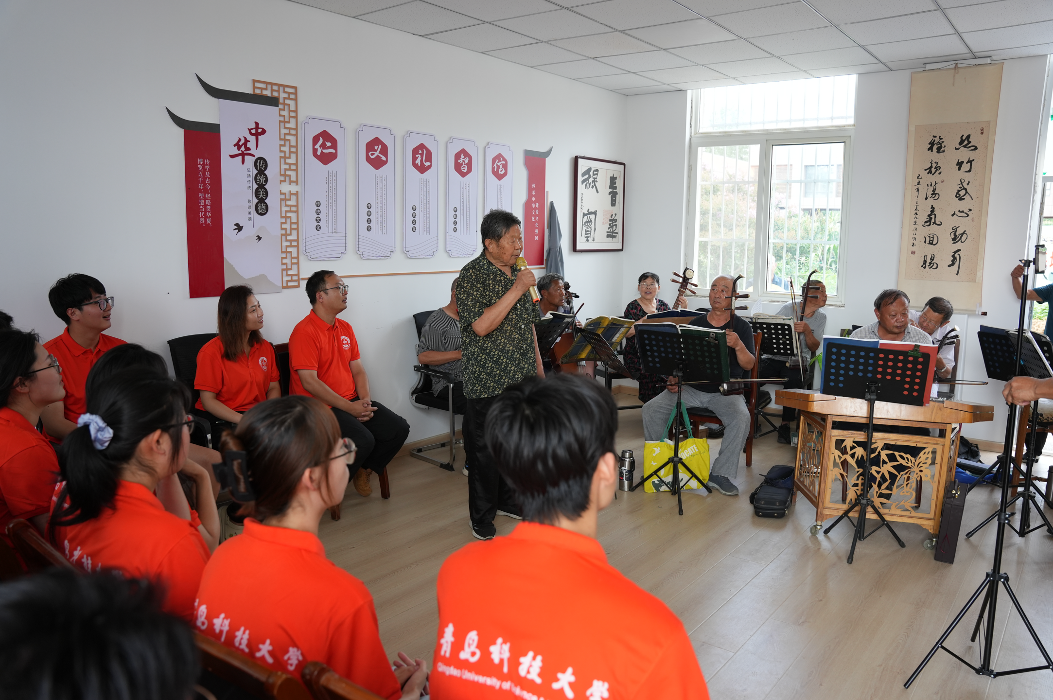 红色宣讲实践团秉承红色文化精神,组织对口养老机构的专业志愿服务。举办了党史教育宣讲、资深干部的传统戏剧展示及青年志愿者的红色经典歌曲演绎等系列文化活动。7月16日在招远市文化馆,实践团成员们聆听了老艺术家们演唱的豫剧与样板戏,这些经典曲目不仅展现了我国传统艺术的魅力,也传递了红色精神。实践团成员们向老一辈们回赠了《没有共产党就没有新中国》、《我和我的祖国》等曲目。这场艺术交流活动,宛如一座跨越时空的桥梁,连接起不同年代的人们,共同在红色精神的传承道路上携手前行。它让实践团成员们深刻领悟到红色文化与传统艺术的紧密交融,更激发了同学们内心深处的责任感和使命感。