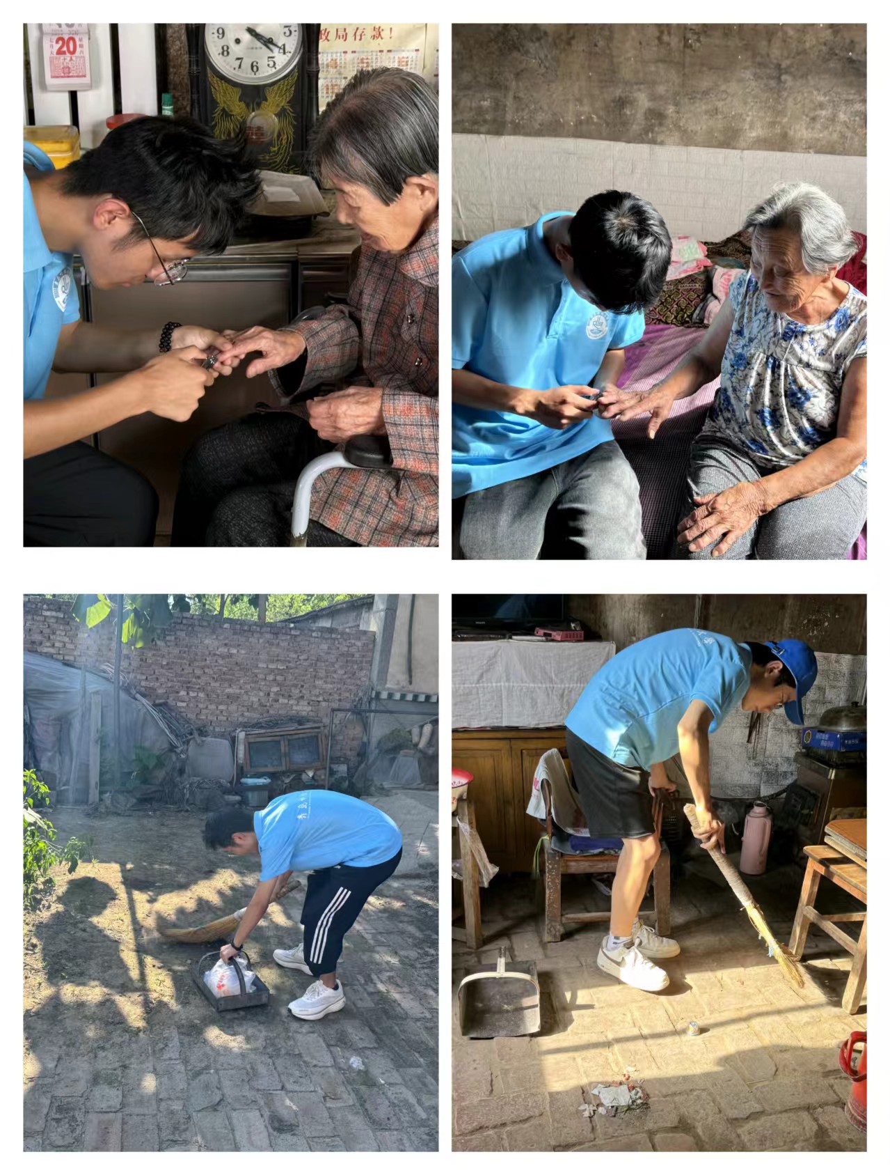 聊天之余,志愿者们还为行动不便的老党员修剪指甲,对其庭院进行全面的打扫,还为他们简单清洗日常衣物。志愿者们用实际行动为老党员们送去了崇高的敬意,令老党员们感受到年轻一代大学生的青春活力,得到了老党员们的高度赞扬。