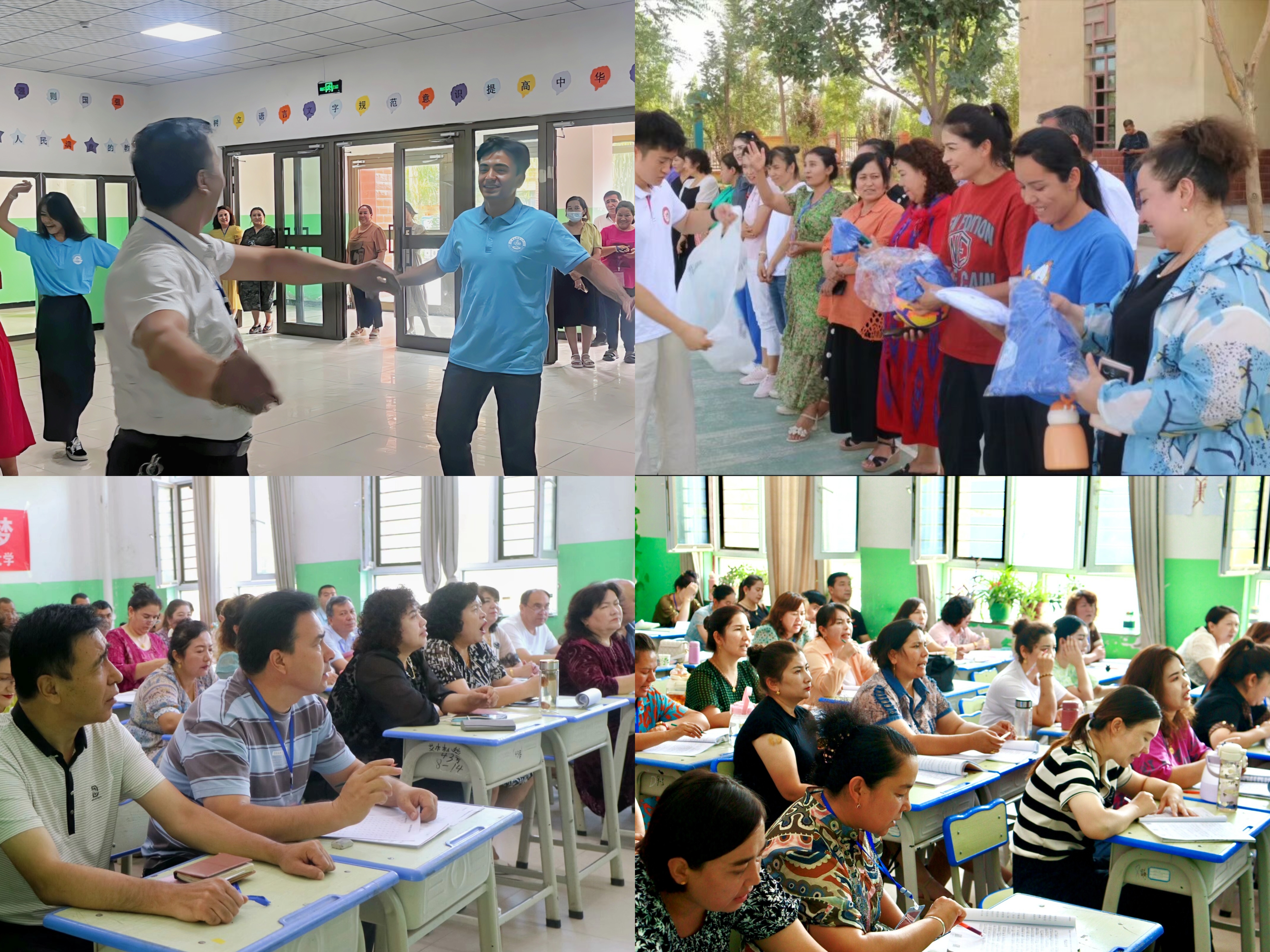 融合少数民族文化,搭建交流平台。实践团结合当地特色,设计各种课间互动活动,各民族师生齐跳民族舞,开展友谊篮球等,以丰富多彩的活动深化了与当地教师学员的友谊,在文字交流碰撞之余,用实际行动诠释“民族团结一家亲”精神,激发教师学员的学习动力与激情,促进交往交流交融,共同铸牢中华民族共同体意识,让普通话之花在喀什大地遍地开放,让青科大的“推普”之名,响彻天山南北。