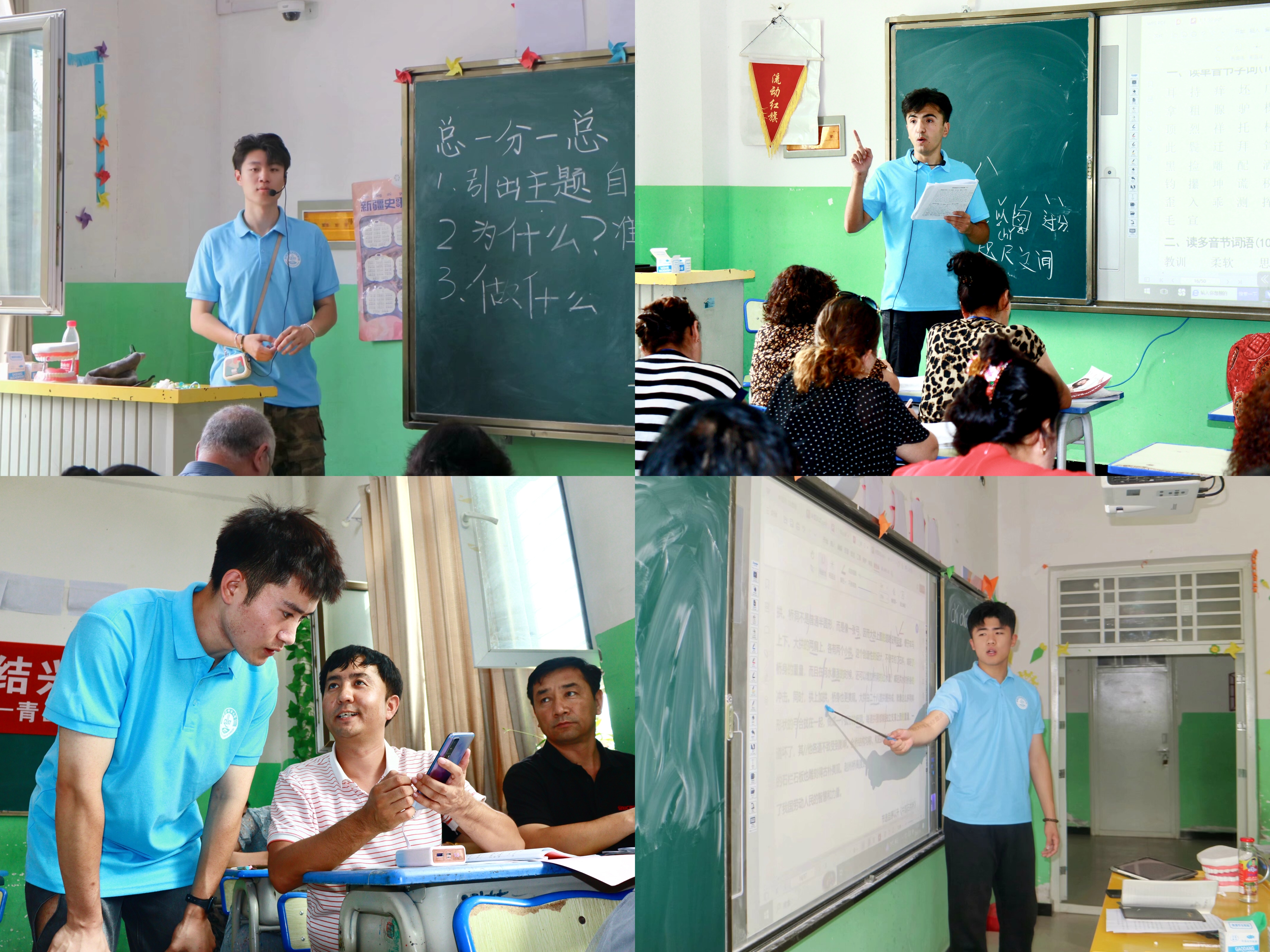 强化推普理论基础。万象城allwincity官网“花开青科石榴红”推普助力乡村振兴支教团中有1名国家级普通话测试员,2名省级普通话测试员,12名助教,负责喀什疏勒县206名教师普通话培训工作。按照“抓住重点、盯紧关键,精准突破、巩固提升”的工作思路,对学员们国家通用语言文字的掌握情况进行再摸底、再分析,从“听、说、读、写”四个方面,做到摸清底,情况明。课上教学,课间总结,交流反馈,专家巡讲。根据前期的调研反馈情况,指导老师们针对学员们存在的声调区分,发音误区等多个方面在四个班级展开内容丰富的专业巡讲,进行专业指导,学员们收获颇丰。课后,实践团积极开展反思总结,交流经验,促进推普有力有效。