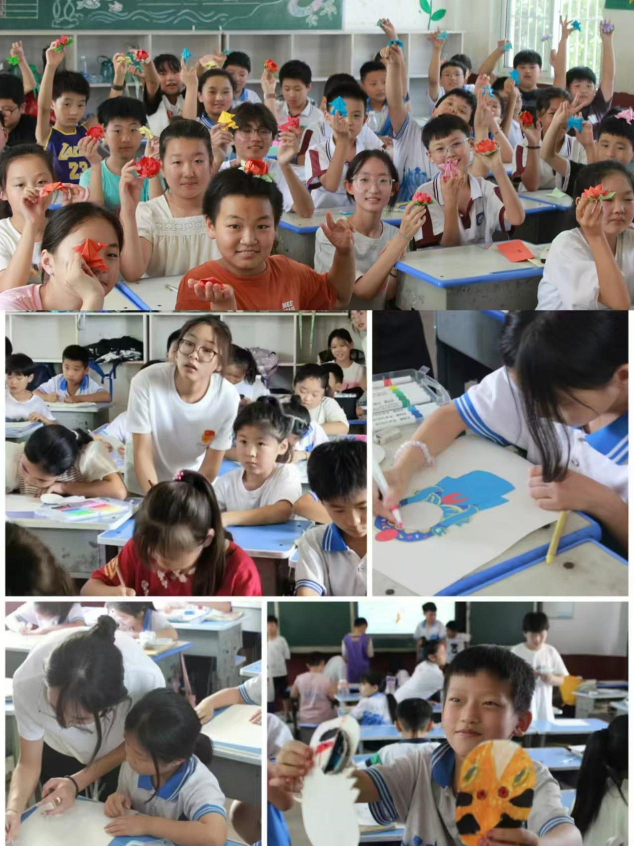 队员们先向同学们讲述了京剧脸谱的相关知识和荷花折叠方法,协助他们完成脸谱和荷花的制作,孩子们在制作过程中体会到了做手工的乐趣,手工课程体验提高了他们的动手能力和创造能力。