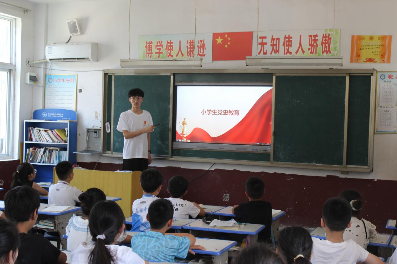 红色教育课上,从中国共产党的成立到改革开放和社会主义现代化建设新时期,从“南湖红船”到“复兴号巨轮”,支教团老师生动地讲述了中国共产党一百年来波澜壮阔的创业史、奋斗史、发展史,带领孩子们感受中国共产党一百年的风雨兼程,一世纪的沧桑巨变。支教团成员力求让孩子们从党史中找寻胜利的源头、汲取前行的力量,在知史爱党、知史爱国中守初心践使命,让奋进在中国梦蓝图上添上浓墨重彩的一笔。