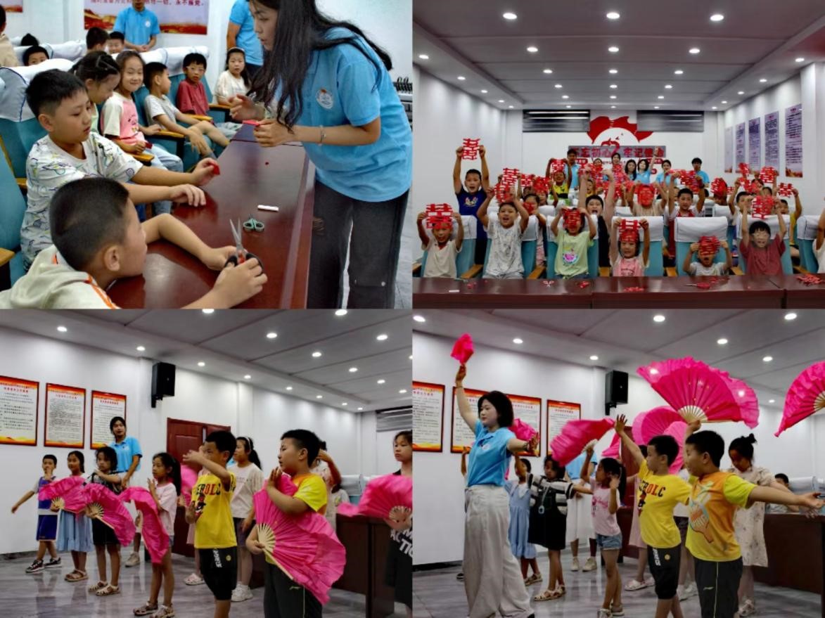 实践队首先为白马石村红石榴学堂的孩子们带来了剪纸和秧歌的宣讲。考虑到孩子们年纪尚小,注意力无法长时间集中,于是队员们更多采用互动式、体验式宣讲方式,激发起孩子们探索了解的兴趣。王涵和牟贝洱教孩子们亲自动手剪出“囍”字,王一凡和郭静姝则带领孩子们跳起了秧歌,期间伴以讲解两种非遗的起源、发展及文化内涵,引导孩子们争做非遗传承推广小使者。孩子们跃跃欲试,参与热情高涨,尽管技艺动作掌握得还不够娴熟,但却在孩子们心中埋下了文化自信的“种子”。