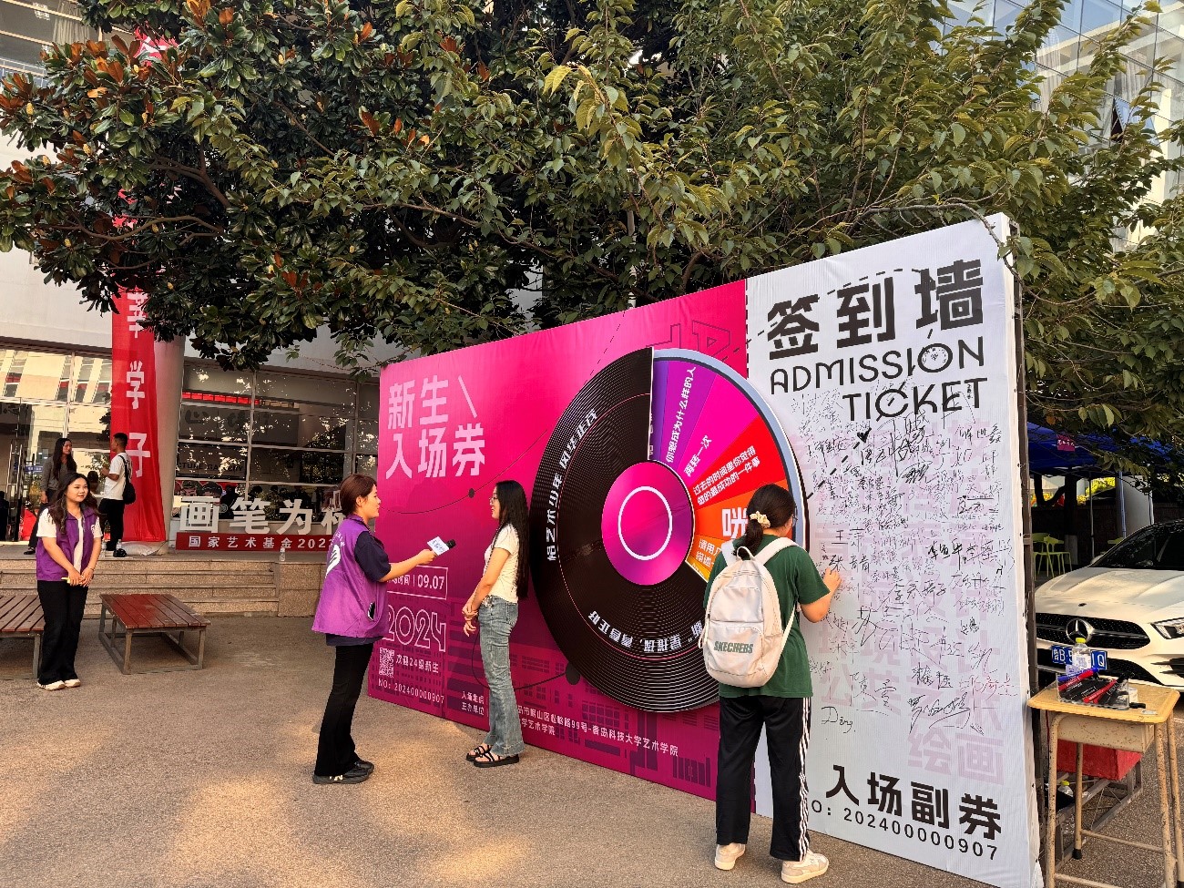 “时光唱片机”主题3D海报吸引了众多新生的目光。通过旋转唱片,新生们可以畅谈过去、展望未来。这一创意不仅让新生们感受到了艺术的魅力,也激发了他们对未来的无限憧憬。