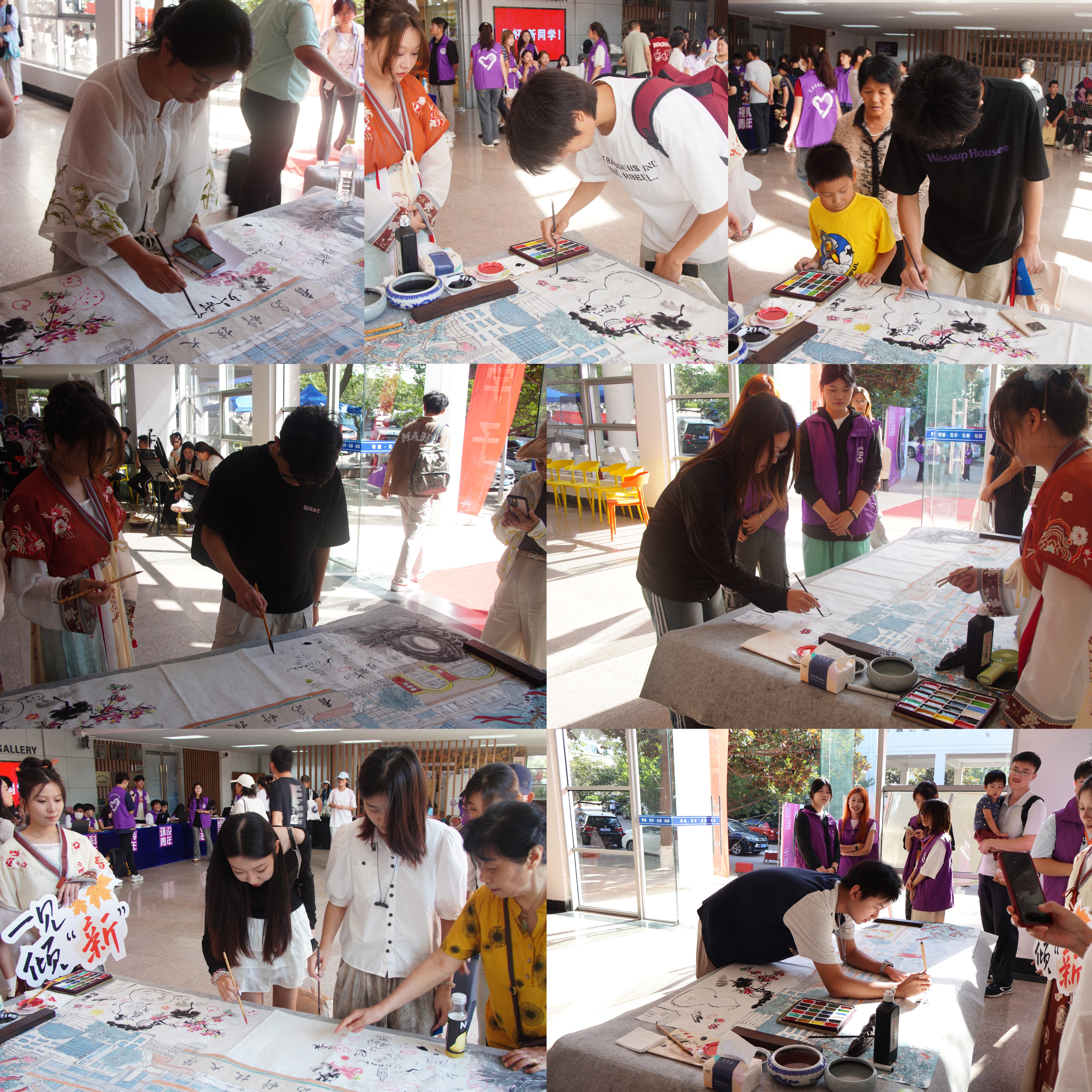 大型书画作品“门们”的创作过程也让新生们感受到了艺术的传承与创新。这幅作品由老生起稿,24级新生接续绘制,寓意着新老传承、共创辉煌的深厚意义。新生们在这里不仅学到了艺术技巧,更领悟到了艺术的精神内涵。