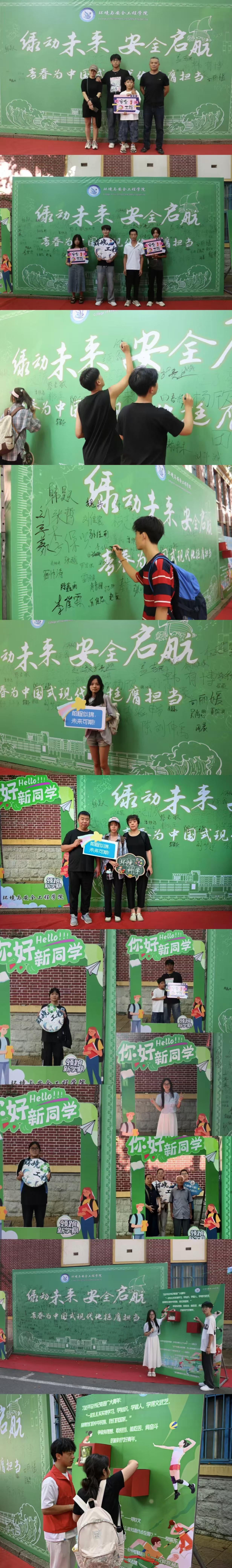 本次迎新以学院团委特色为主线,结合环境与安全两大学科优势,以专业特点为核心,以青春奋斗为基调,设置了“绿动未来,安全启航,青春为中国式现代化挺膺担当”为主题的绿色喷绘,新生在喷绘上签名和写下祝福,展现对未来生活的美好憧憬。