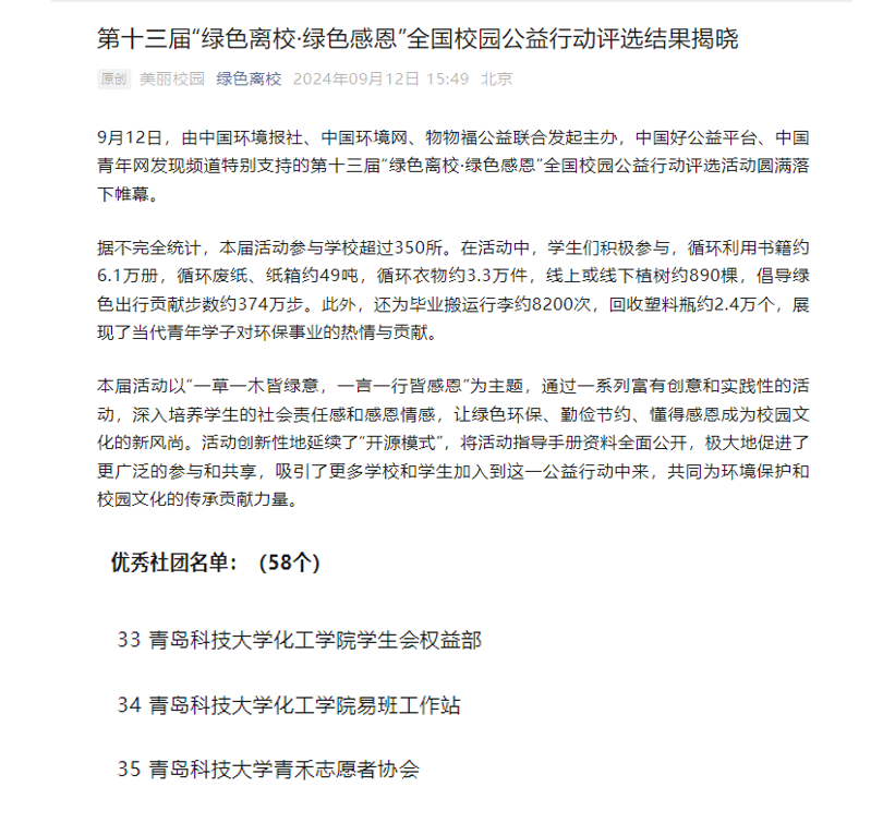 近日,由中国环境报社、中国环境网、物物福公益联合发起主办,中国好公益平台、中国青年网发现频道特别支持的第十三届“绿色离校·绿色感恩”全国校园公益行动评选活动圆满落下帷幕,经过严格对项目主题、执行力度、成果展示、关注热度、线上点赞量等方面的综合评比,58个社团获得“优秀社团”称号,168位同学获得“优秀志愿者”称号,化工学院团委在本次评选中获多项奖励。