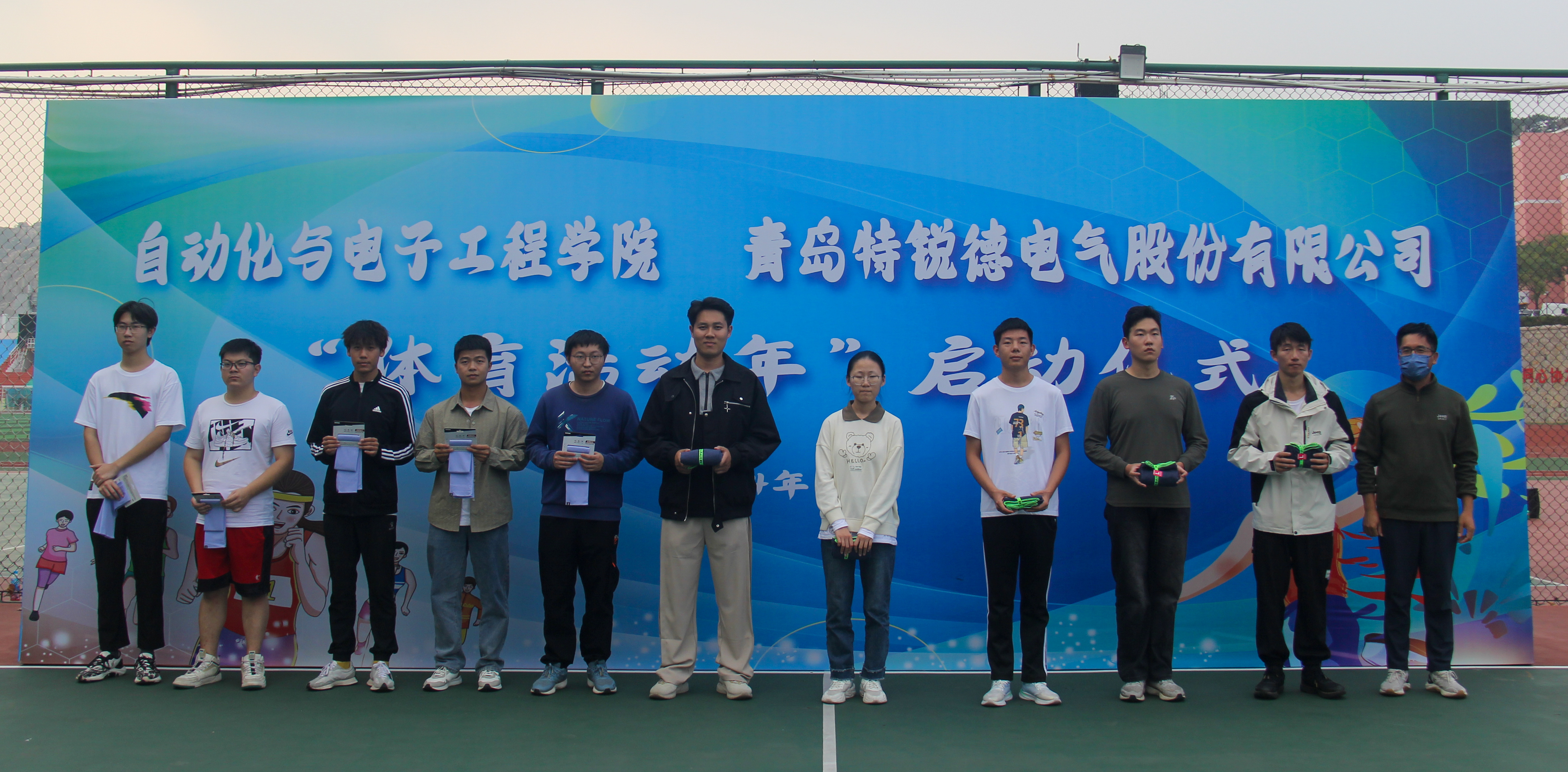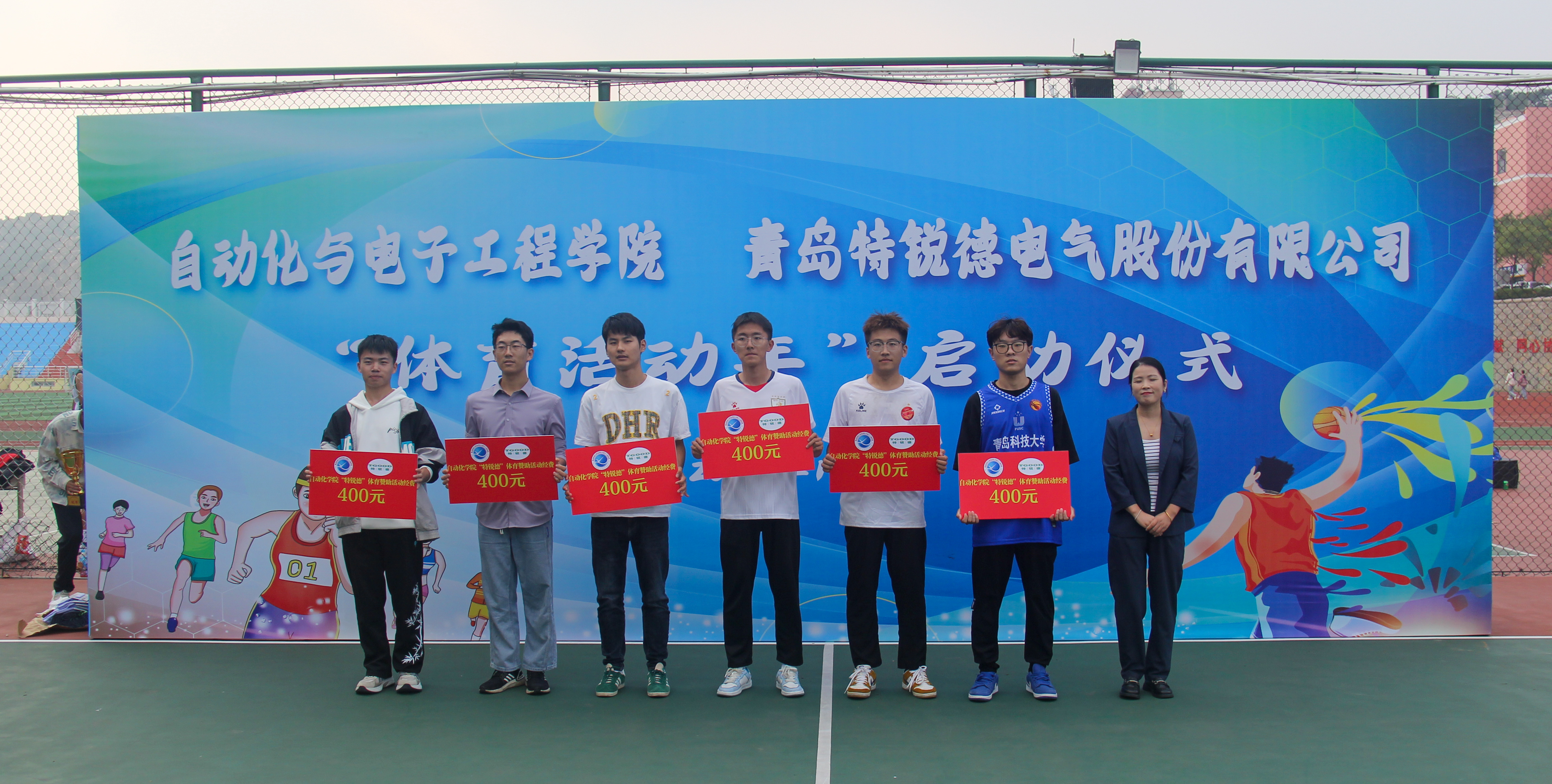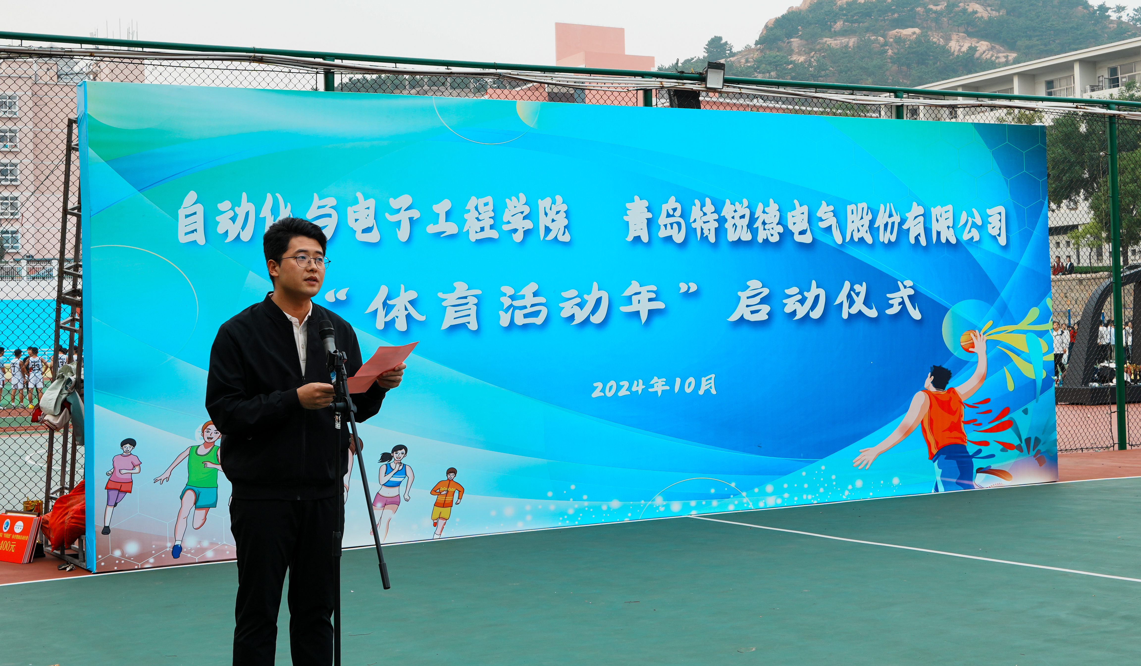 为进一步增强青年学生体质,弘扬体育精神,促进校企合作在体育领域的深度融合,10月15日下午,自动化与电子工程学院团委与青岛特锐德电气股份有限公司联合举办的“大学生体育活动年”启动仪式于南苑篮球场举行。青岛特锐德电气股份有限公司人力资源中心人力总经理助理张莹,学院党委书记李卉,学校教务处专职教学督导员楚晓东、学生处副处长李春家、团委副书记李浩,学院党委副书记兼副院长刘名森出席启动仪式。仪式由学院团委书记兼学工办主任雷静主持。