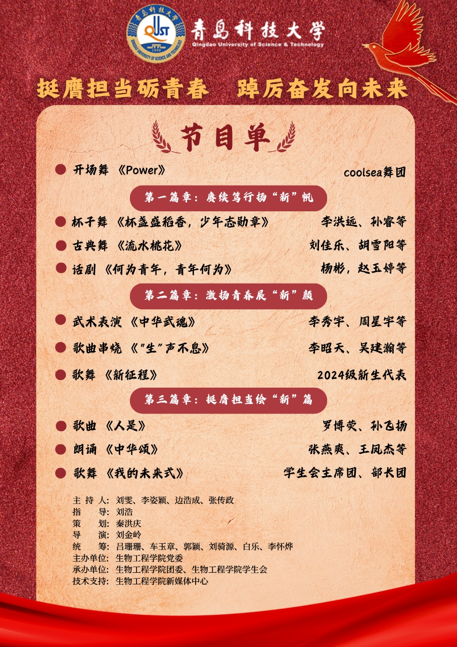 晚会虽已落下帷幕,但青春旋律永不停歇。韶华未央,梦想不息,生物工程学院全体师生将以此为契机,继续发扬“挺膺担当砺青春,踔厉奋发向未来”精神,以更加饱满的热情和坚定的信念,持续推进学院学风与文化建设,为学校建设“特色鲜明、走在前列”的高水平大学贡献智慧,为推进中国式现代化建设新征程挺膺担当。