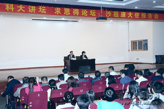 为深入贯彻落实党的十八大和十八届三中、四中全会精神,深入学习习近平总书记系列重要讲话精神,认真落实《关于进一步加强和改进新形势下高校宣传思想工作的意见》,积极培育和践行社会主义核心价值观,引导广大师生员工正确把握国际形势新变化新特点,进一步统一思想、坚定信念、凝聚力量,为实现中华民族伟大复兴的中国梦而努力奋斗,5月19日下午,党委宣传部、马克思主义学院、团委、科技处联合举办科大讲坛、求思得论坛,邀请联合国原副秘书长、联合国可持续发展大会秘书长、我国著名外交家沙祖康大使作“实现中国梦的国际环境”专题报告。